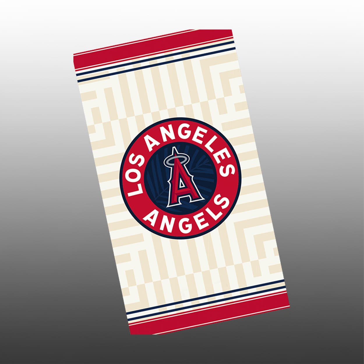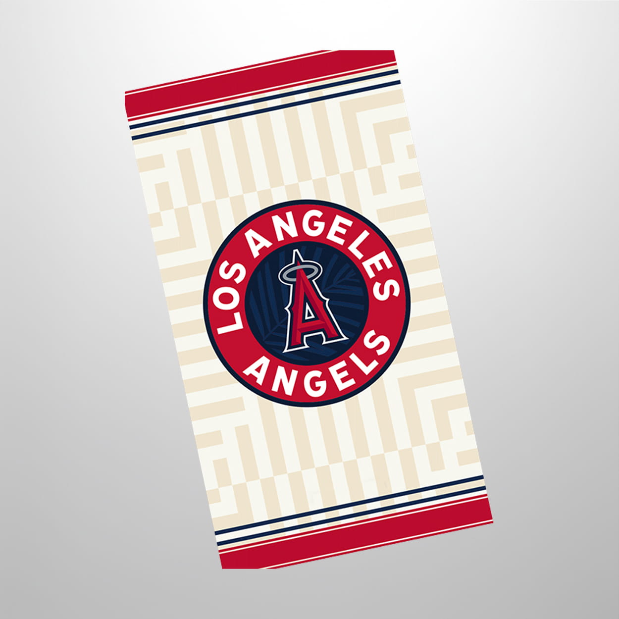 The design is a masterclass in “beach chic” meets “baseball pride.” At the heart of the towel sits the oversized City Connect circular crest, proudly displaying “Los Angeles Angels” in bold, athletic typography. Peek closer at the center, and you’ll find the iconic “A” logo set against a subtle, dark navy palm frond pattern—a playful nod to the breezy lifestyle of the OC. The background features a sophisticated geometric pattern that mimics the rhythmic ebb and flow of Pacific waves, making it a statement piece for fans who think outside the diamond.