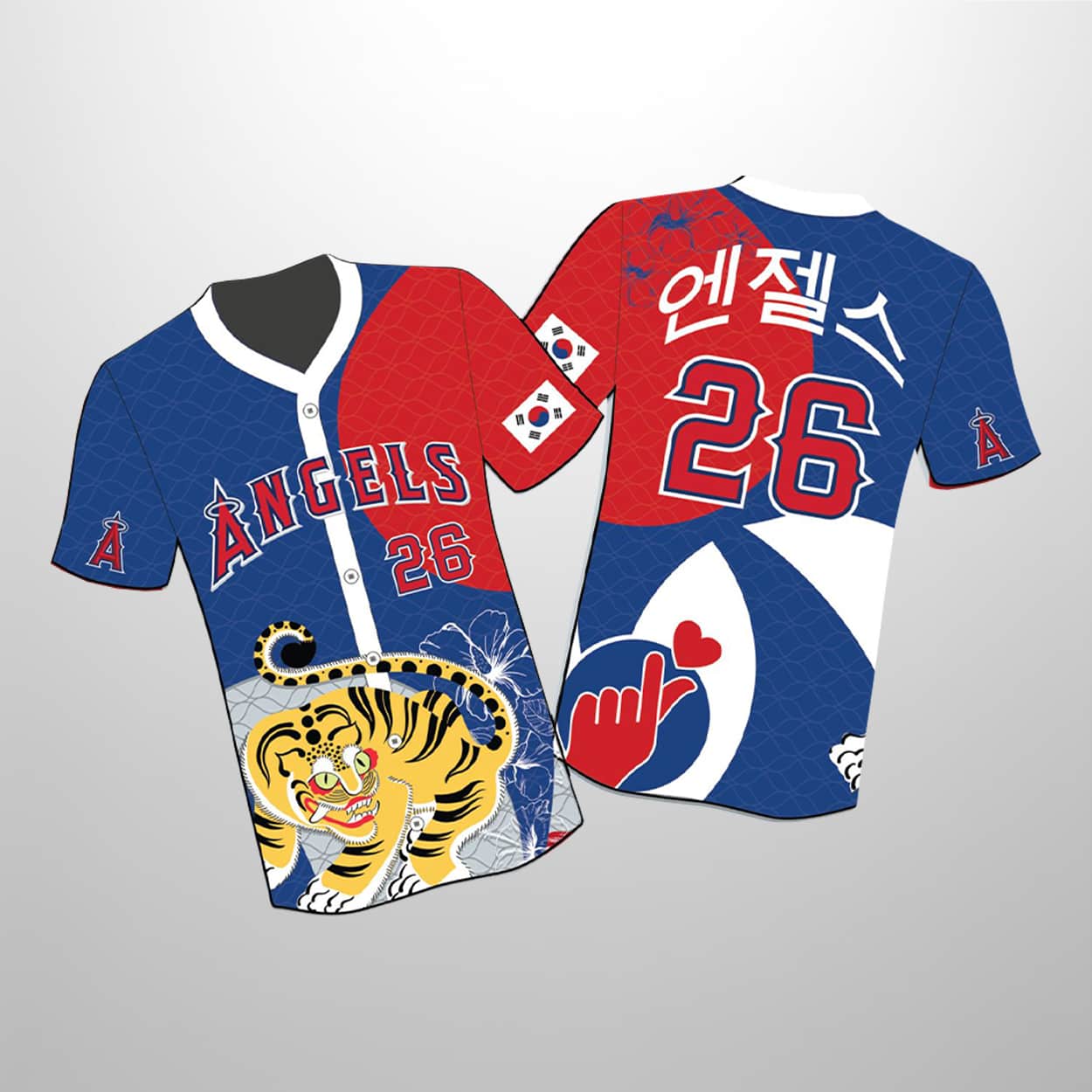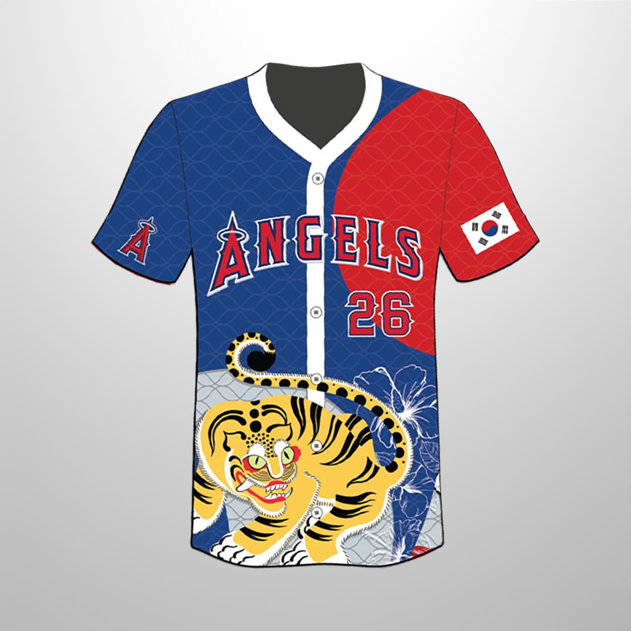 Get ready to turn heads at the ballpark with this jersey—a dazzling fusion of team spirit and Korean tradition. This jersey features a split red-and-blue front, boldly emblazoned with “ANGELS” and the number “26” in crisp white and blue outlines. A fierce, traditional Korean tiger prowls across the lower front, surrounded by elegant floral accents. On the sleeves, the South Korean flag and the Angels’ stylized “A” logo proudly represent unity and pride. Flip it around, and you’ll find “엔젤스” (Angels in Hangul) above the number 26, with a playful finger heart graphic and floating red heart that seals the look with charm.