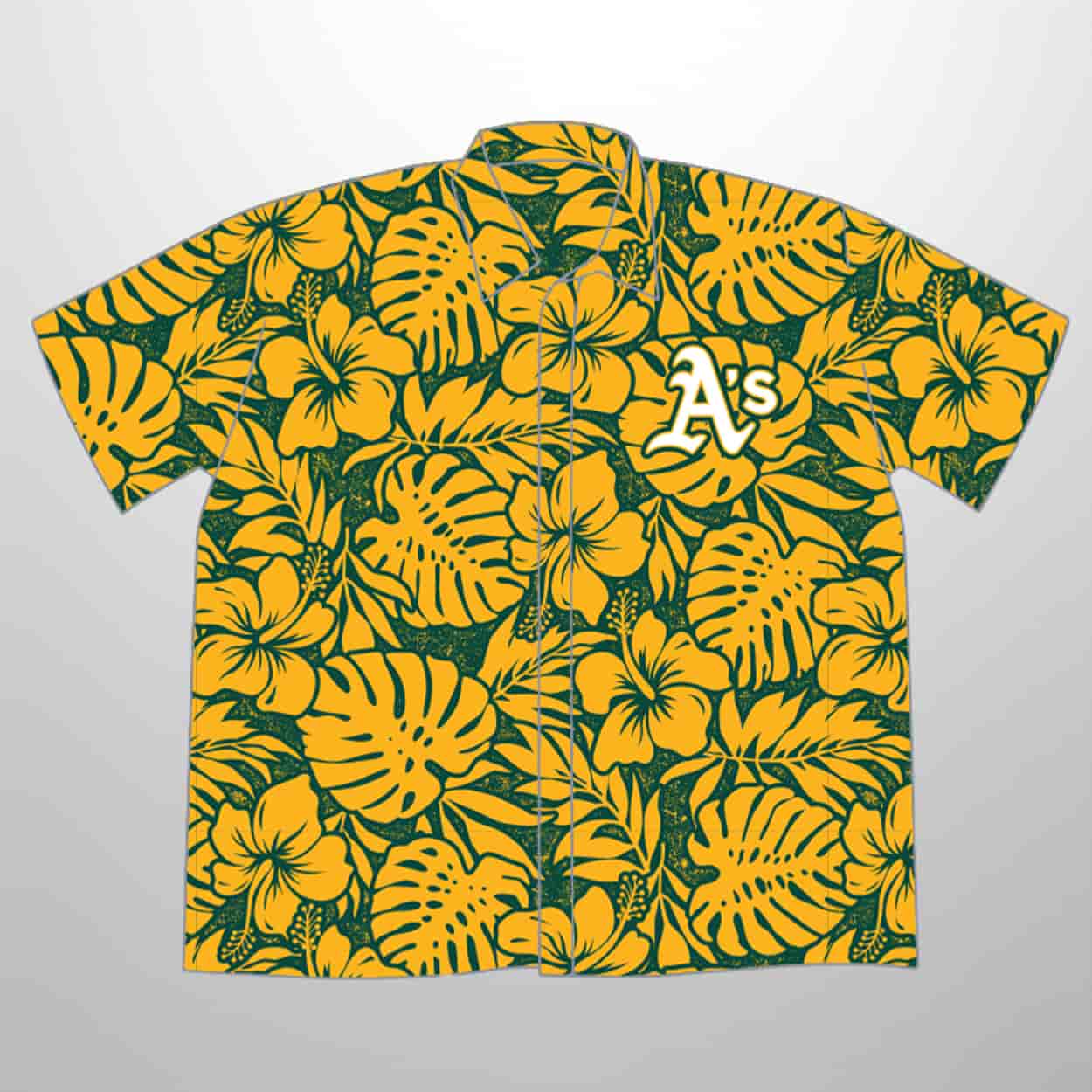 Turn Father’s Day into a celebration of sunshine, baseball, and bold fashion with this shirt. This short-sleeved stunner bursts with tropical energy, showcasing bright yellow hibiscus flowers and lush green leaves across its design. On the left chest, the classic A’s logo stands out in crisp white with a green outline, proudly anchoring the shirt in team spirit. It’s the ultimate blend of Oakland pride and vacation vibes, making every fan feel like they’re cheering from paradise.