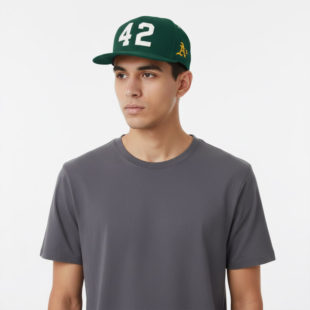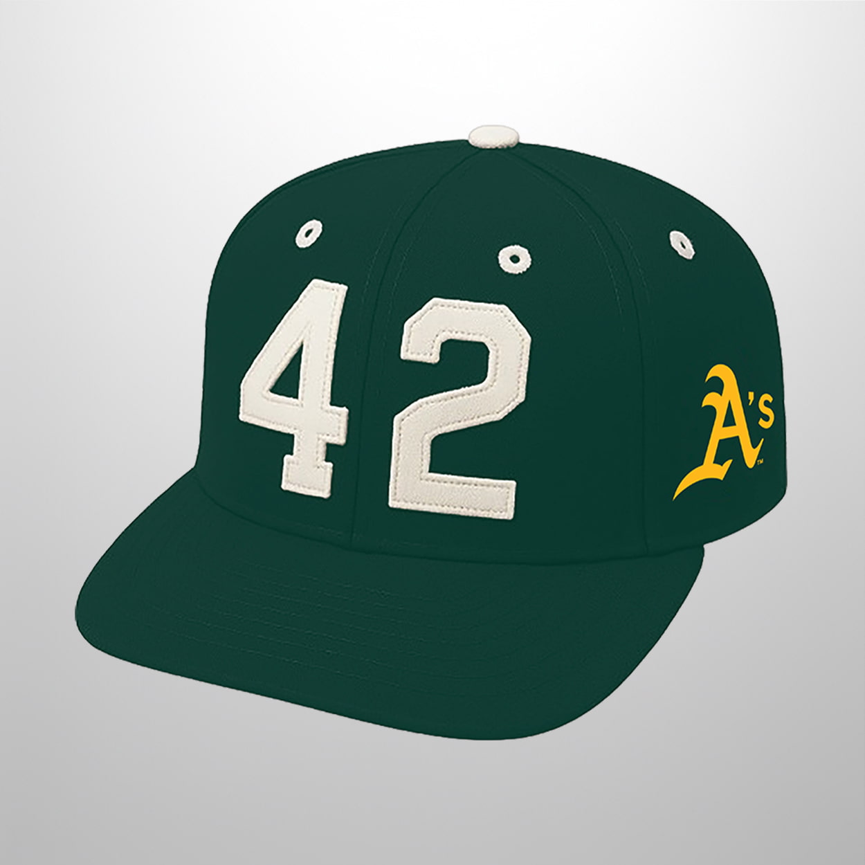 Step into the ballpark with a cap that’s more than just headwear—it’s history stitched into every detail. This hat features a deep green crown, proudly displaying the legendary number 42 in crisp white across the front. On the side, the familiar yellow-and-white Oakland A’s logo adds team pride to this timeless tribute. It’s the perfect blend of heritage and hometown spirit, designed to stand out in the crowd.
