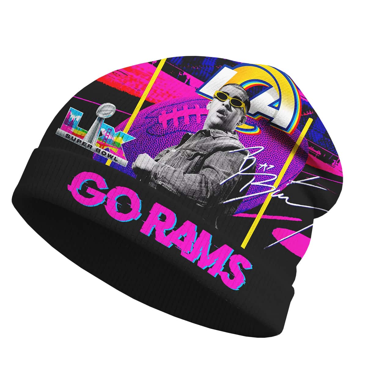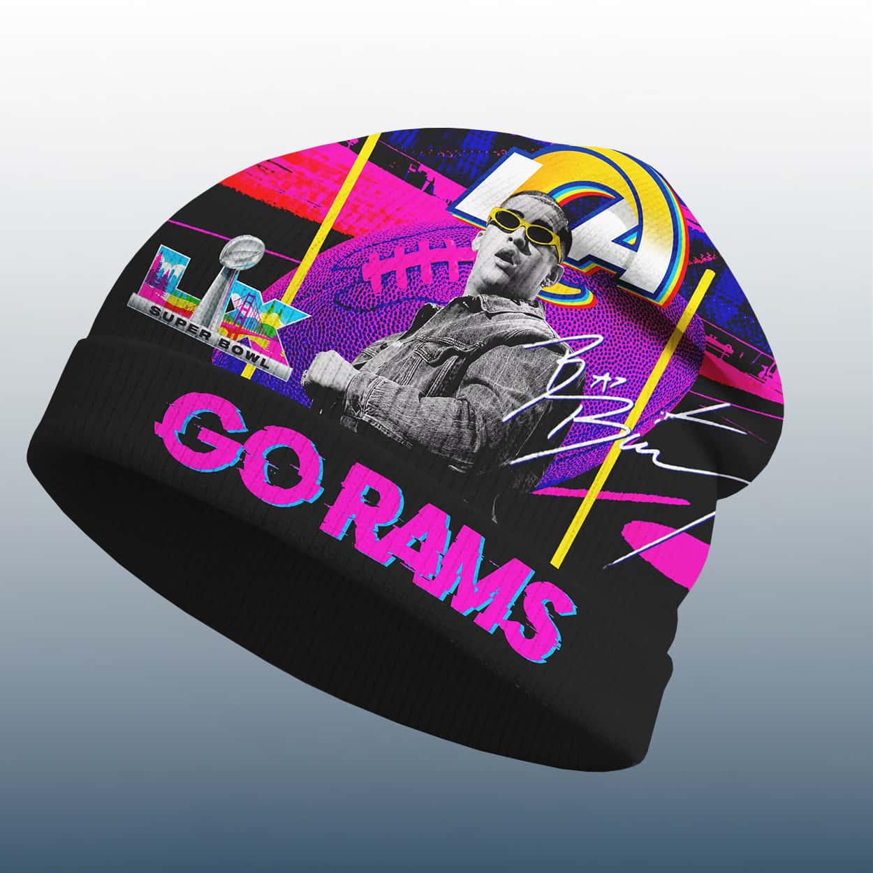 Get ready to rock the ultimate fusion of sports pride and pop culture with this hat. This electrifying headwear bursts with neon energy, featuring a stylized Bad Bunny rocking sunglasses, the SB LX logo, and a bold “GO RAMS” shout-out in hot pink. The Rams’ iconic logo anchors the design, while a Bad Bunny’s signature—adds a touch of celebrity swagger. It’s not just a beanie; it’s a billboard of hype.