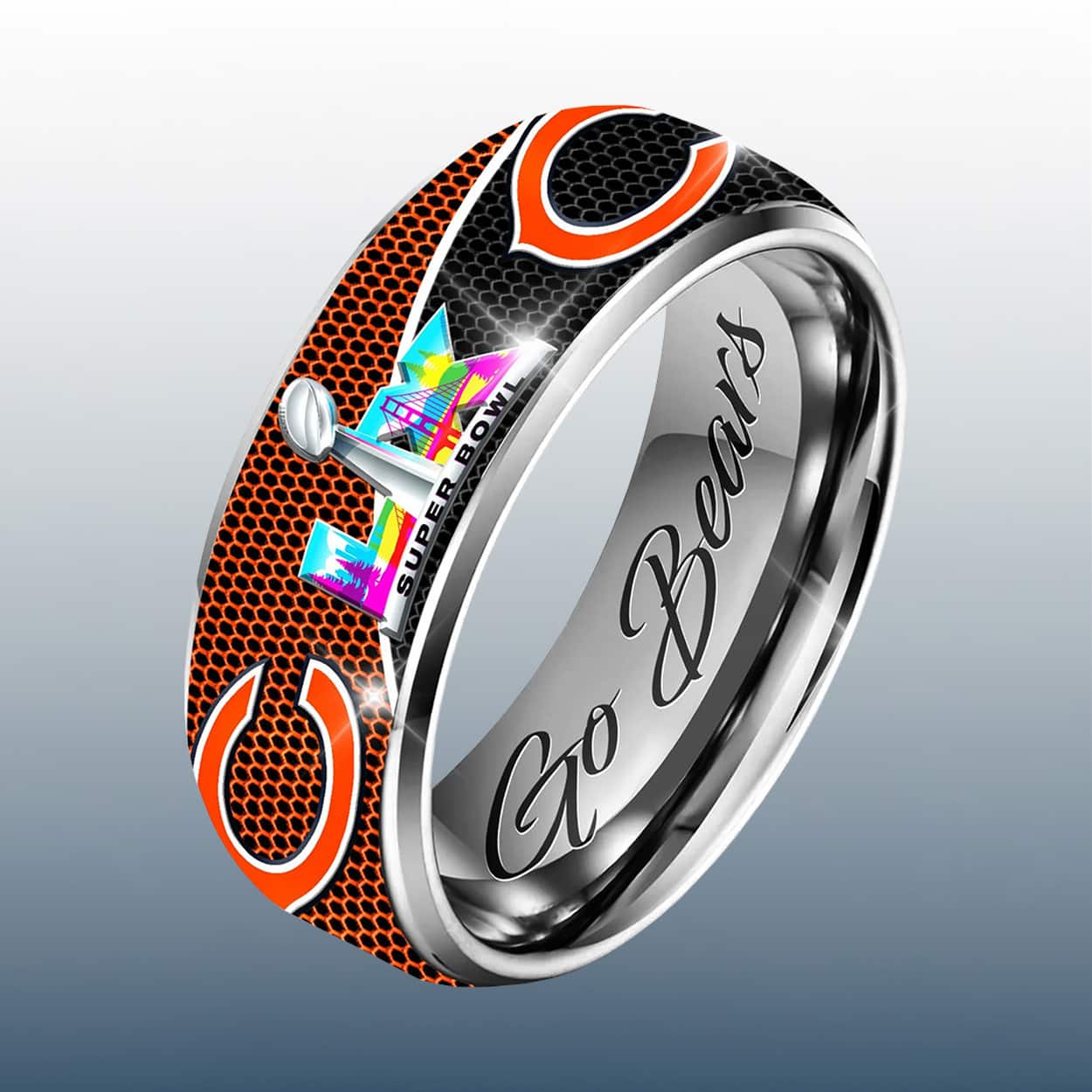 This ring is more than just a keepsake—it’s a wearable roar of triumph. Wrapped in a striking orange and black textured band, this ring proudly showcases two blazing orange “C” logos, unmistakably representing the Bears. Front and center, the vibrant “LX” emblem and the words “SB” announce the team’s legendary win with unapologetic swagger. Flip it over and you’ll find the inner engraving: “Go Bears”—a rallying cry etched for die-hard fans who bleed navy and orange.