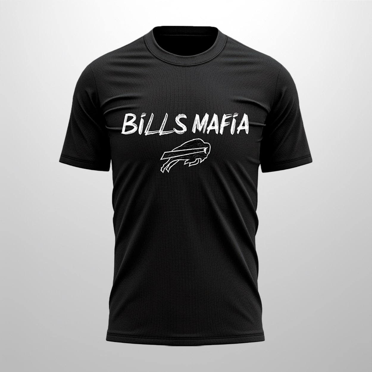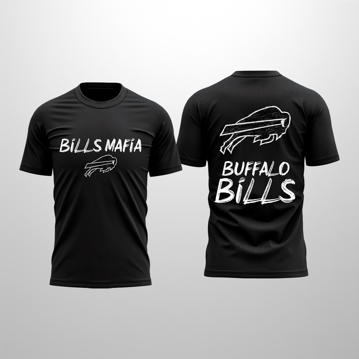 Step into the spotlight with this shirt—a tribute to the loudest, proudest fanbase in football. The front of this sleek black tee showcases the rallying cry “BILLS MAFIA” in crisp white lettering, perched above a fierce, stylized buffalo logo. Flip it around and you’ll find the same buffalo charging forward, now larger than life, with “BUFFALO BILLS” stamped boldly beneath it. Whether you’re tailgating, watching from the couch, or storming the stadium, this shirt makes sure your allegiance is never in question.