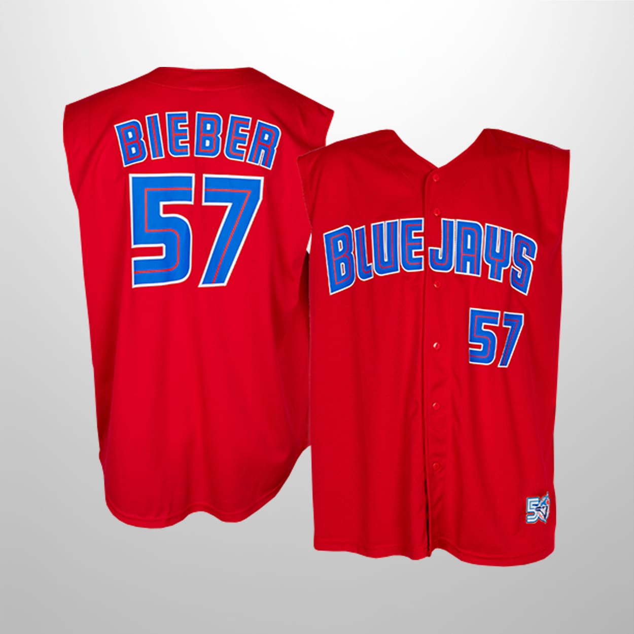 This jersey is a true standout piece. With its striking red sleeveless design, this jersey features “BLUEJAYS” emblazoned across the chest in bold blue and white lettering, paired with the number 57 for a sharp, athletic look. Flip it around, and the back proudly displays “BIEBER” above the same number, making it unmistakably unique. A commemorative patch near the hem adds an extra touch of celebration, marking this giveaway as more than just apparel—it’s a collectible.
