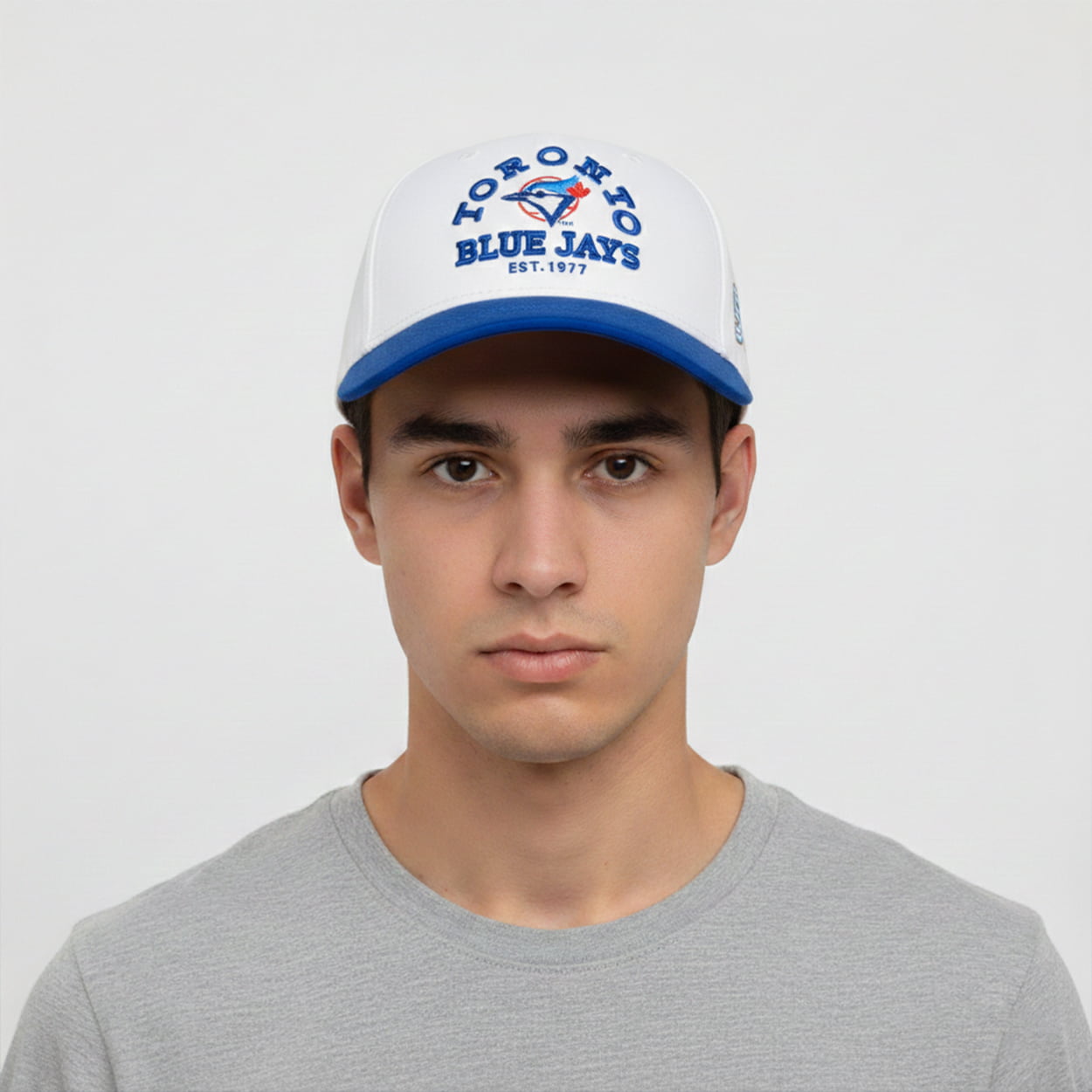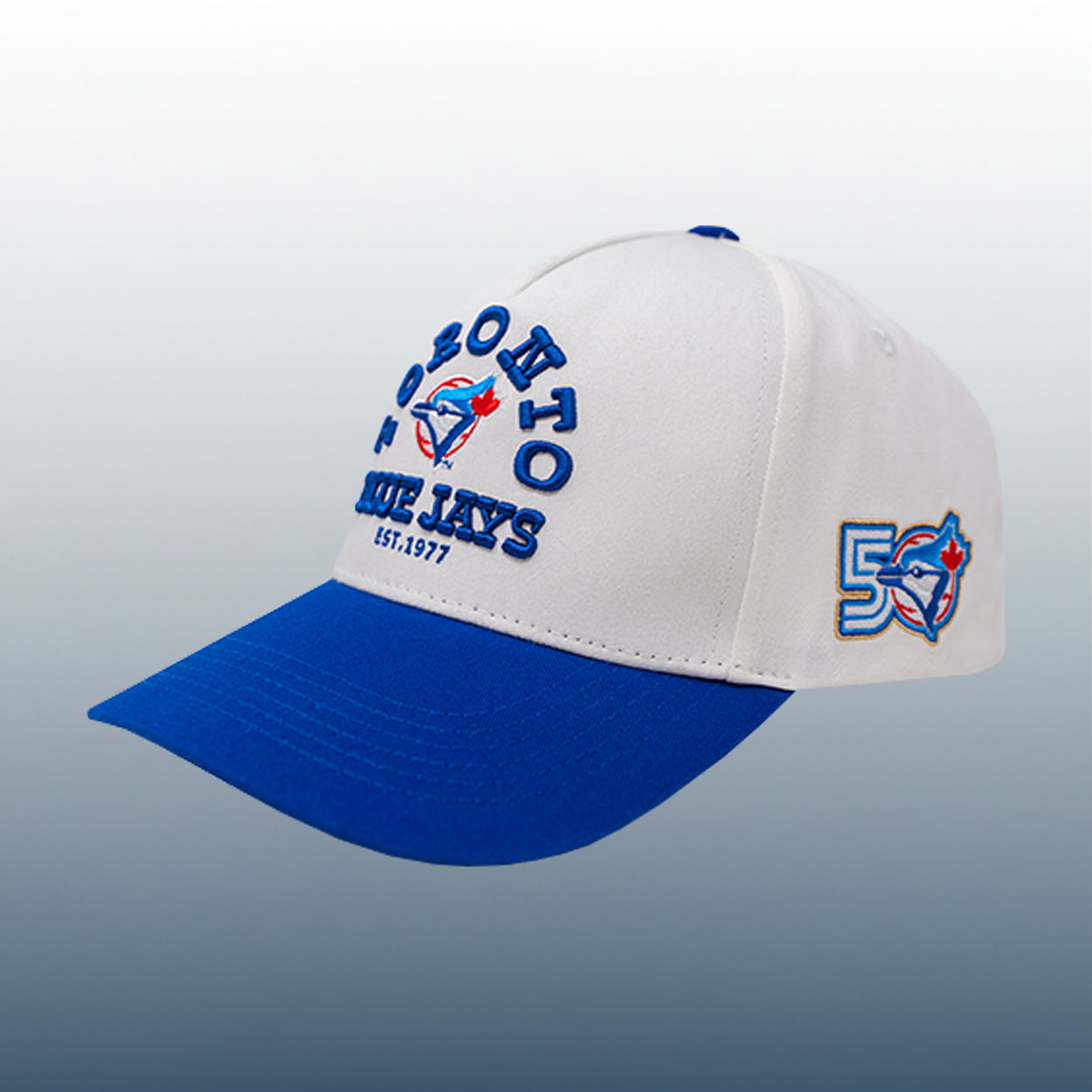 This hat is a striking tribute to half a century of baseball excellence. With a crisp white crown and bold blue brim, the front panel proudly showcases “TORONTO BLUE JAYS EST. 1977” embroidered in vivid blue, flanking the team’s iconic logo. On the side, a commemorative “50” emblem accented with the Blue Jays insignia marks the franchise’s 50th anniversary, turning this cap into a celebratory keepsake. It’s a design that balances heritage with fresh style, perfect for fans eager to wear their loyalty on Opening Night.
