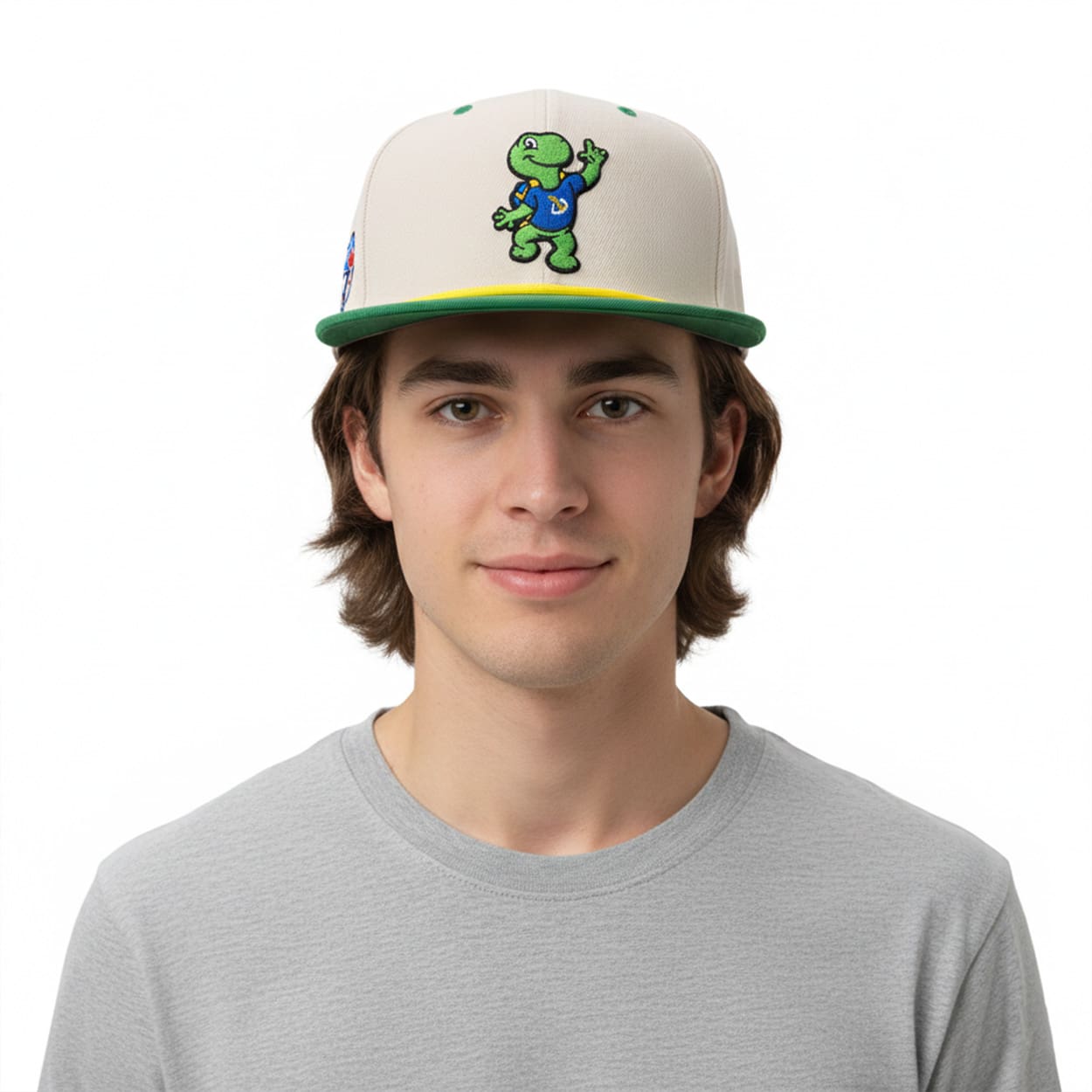 This hat is a standout piece that fans will treasure. With a beige crown and a green brim accented by a bright yellow trim and top button, the design instantly pops. Front and center, an embroidered cartoon turtle wearing a jersey with the number “3” adds a playful twist, making this cap unlike any other. On the side, a commemorative patch featuring the number “50” alongside a red maple leaf and a blue jay proudly marks the team’s milestone anniversary. It’s a hat that balances fun with history, perfect for fans who want to celebrate in style.