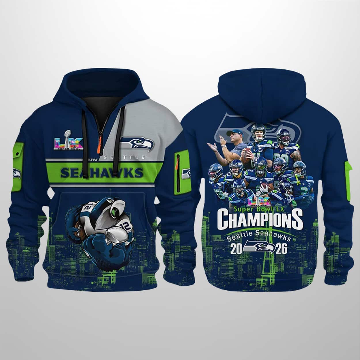 Celebrate the Seattle Seahawks’ dominant 29-13 victory over the Patriots in SB LX with the 2026 Bowl LX Champions Seahawks Half-zip Hoodie.