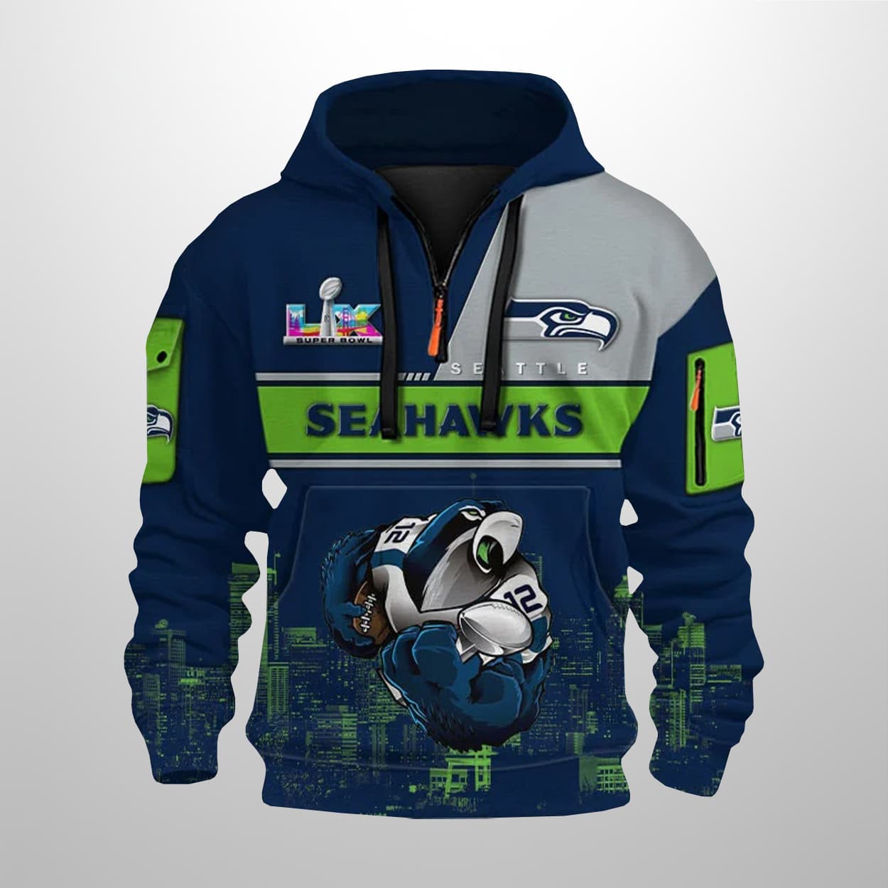 Fly high with the 12s in this vibrant tribute to Seattle’s historic second world title. Drenched in signature Navy, Wolf Grey, and explosive Action Green, this half-zip hoodie is a walking mural of the 2025 season’s success. The front features a bold “SEAHAWKS” banner and a fierce, armored Seahawk mascot clutching a football—symbolizing the iron-clad grip the team held over the game in Santa Clara. With utility pockets on the sleeves and the SB LX logo sitting proudly on the chest, it’s the ultimate trophy for your wardrobe.