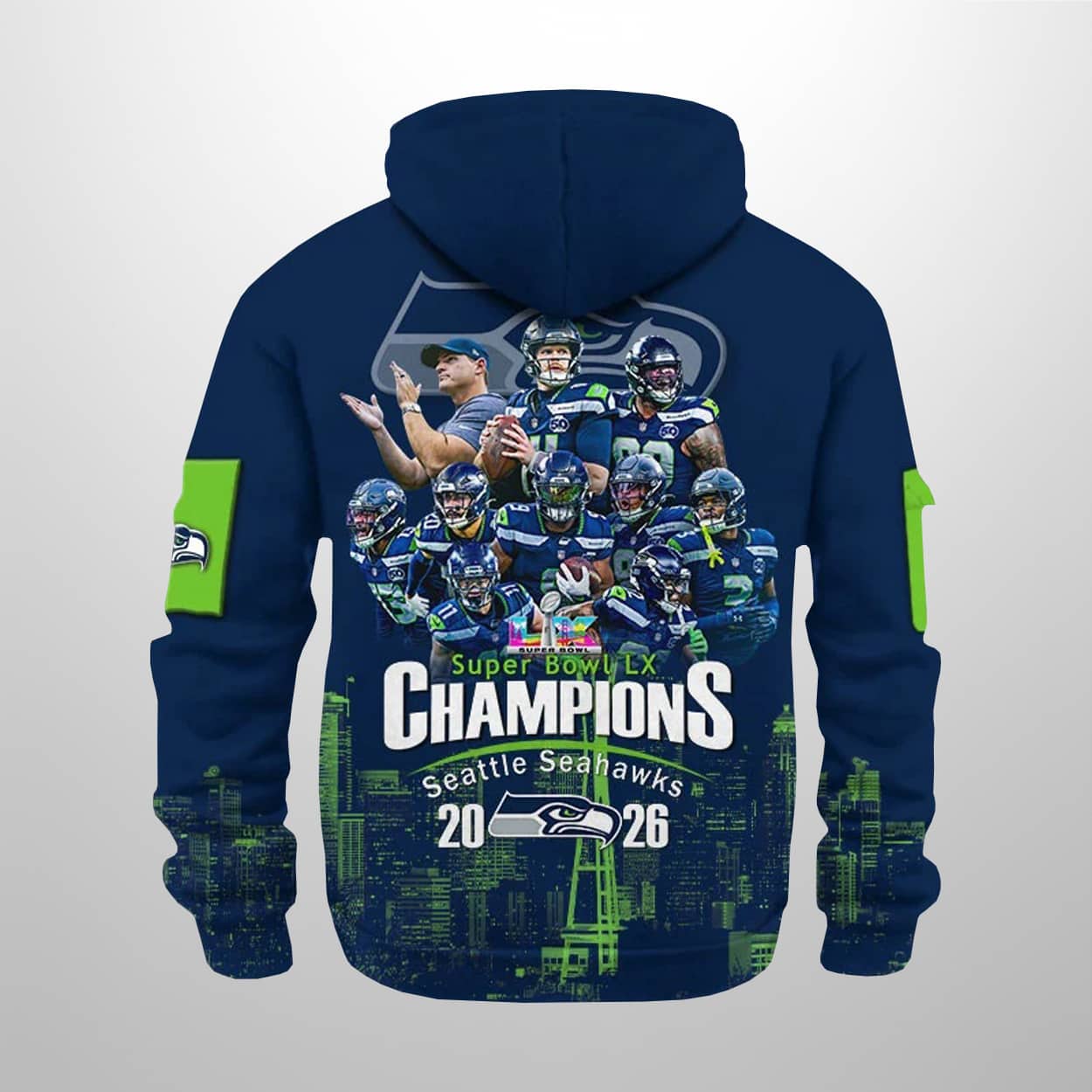 This design captures the soul of the “Dark Side” defense that held the Patriots scoreless for three full quarters. Turn it around to find a cinematic collage of the architects of the 29-13 victory, including Head Coach Mike Macdonald and the stars who silenced the doubters. It’s not just a hoodie; it’s a detailed narrative of Kenneth Walker III’s MVP performance and the relentless pass rush that brought the Lombardi Trophy back to the Pacific Northwest.