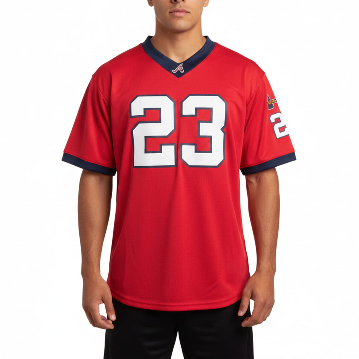Get ready to cheer in style with this jersey. This vibrant red jersey showcases the legendary number â23â in crisp white with a bold outline, displayed prominently on the front and sleeve. Dark blue trim accents the collar and cuffs, adding a sharp contrast that makes the design pop. Above the number, a sleek emblem sits proudly near the collar, mirrored on the sleeve, giving the jersey a polished, team-first look. Itâs a striking piece that captures the excitement of Braves fandom while honoring one of the teamâs brightest stars.