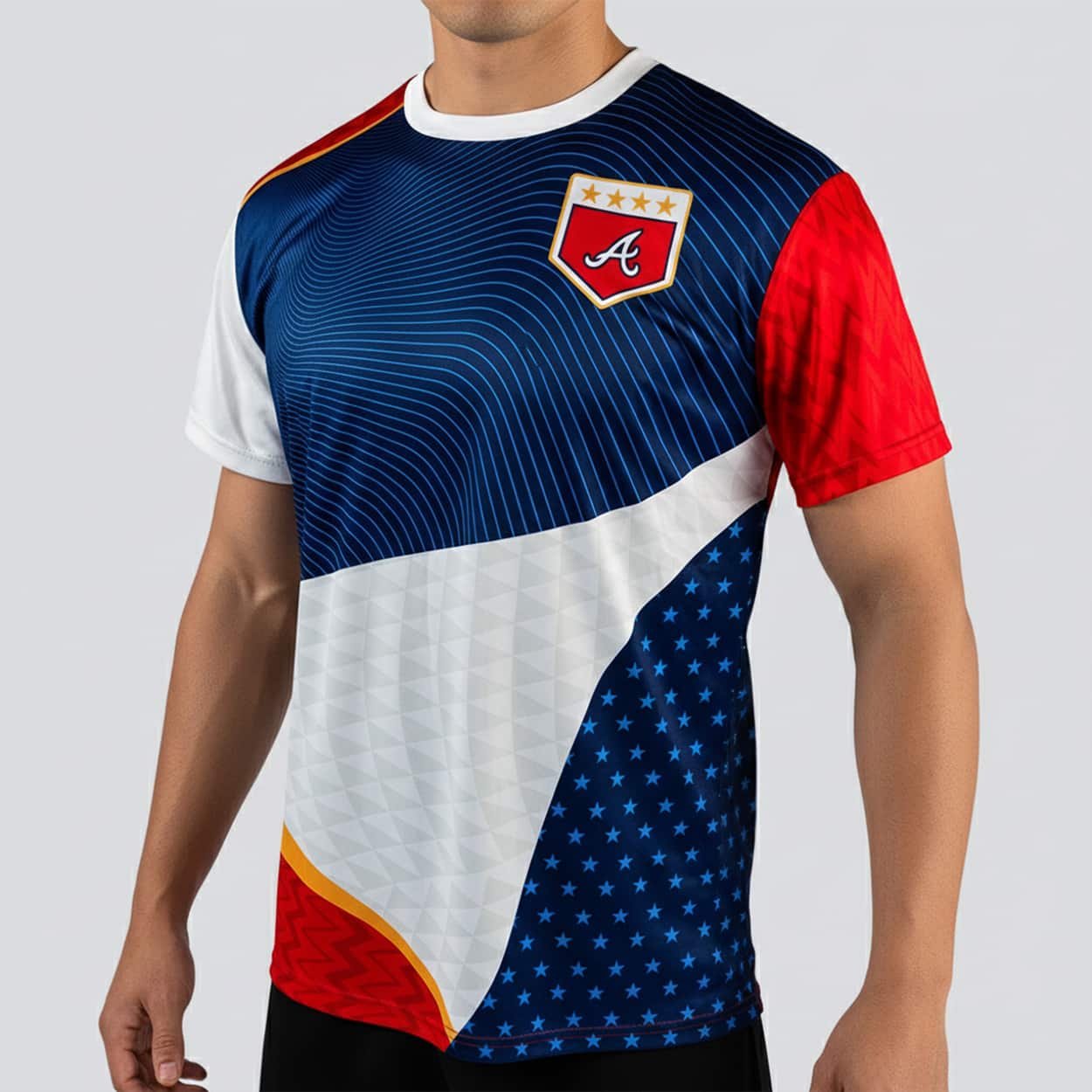The Braves are kicking off 2026 with an item that blends baseball passion with soccer-inspired flair. This short-sleeved jersey features a vibrant mix of dark blue, white, red, and yellow, creating a dynamic, eye-catching design. The chest proudly displays a shield-shaped emblem with a bold red background, a stylized white “A,” and three stars above, all bordered in yellow for emphasis. The right sleeve pops in red, while the left balances in crisp white. A section of small white stars on a deep blue field adds a patriotic touch, complemented by a sweeping yellow accent near the hem. It’s a jersey that radiates energy and team pride from every angle.