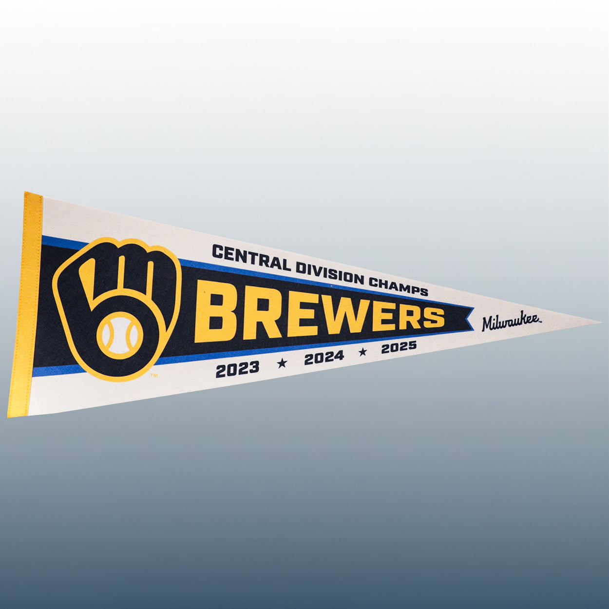 This pennant is more than memorabilia—it’s a victory flag for every fan. This triangular pennant shines in white, accented with the team’s signature blue and yellow. On the left, the iconic Brewers glove logo cradles a baseball, instantly recognizable as a symbol of Milwaukee pride. Across the pennant, bold text proclaims “Central Division Champs” above the team name “BREWERS,” with the years 2023, 2024, and 2025 proudly displayed like badges of honor. At the base, “Milwaukee” ties the design back to the city that fuels the team’s energy and tradition.