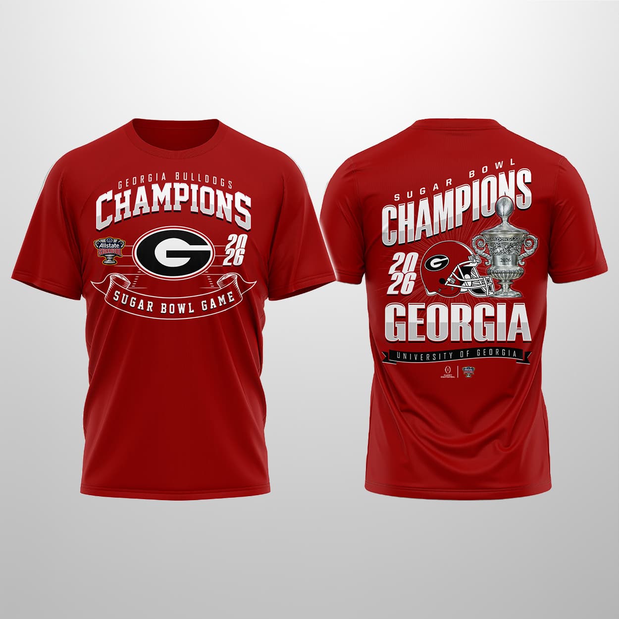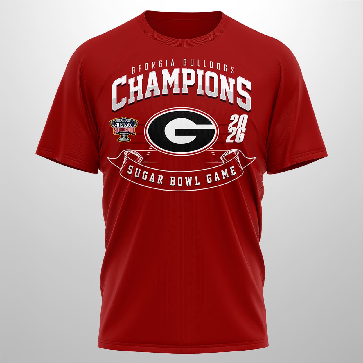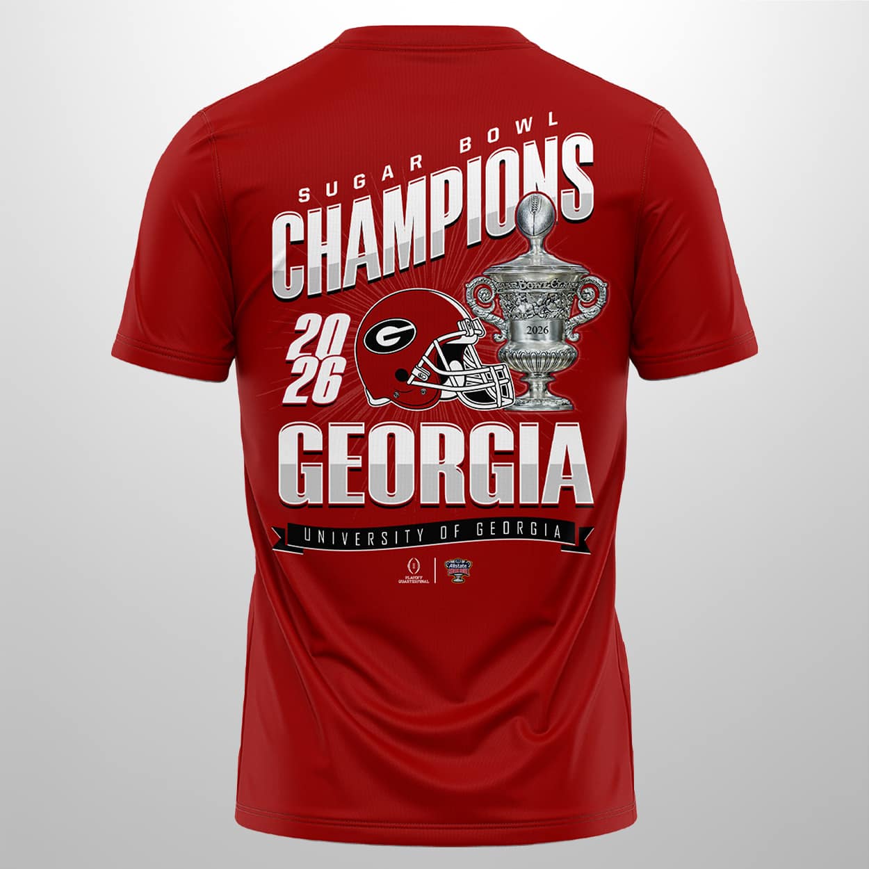 Step into victory with this shirt—a wearable tribute to Georgia’s unforgettable triumph. The front bursts with energy: “GEORGIA BULLDOGS CHAMPIONS SUGAR BOWL GAME 2026” wrapped around the iconic Bulldogs logo, making it clear you’re team royalty. Flip it around and the celebration continues: “SUGAR BOWL CHAMPIONS 2026 GEORGIA UNIVERSITY OF GEORGIA” proudly frames a bold image of the Sugar Bowl trophy, flanked by the team’s emblem. It’s not just a shirt—it’s a scoreboard of success.