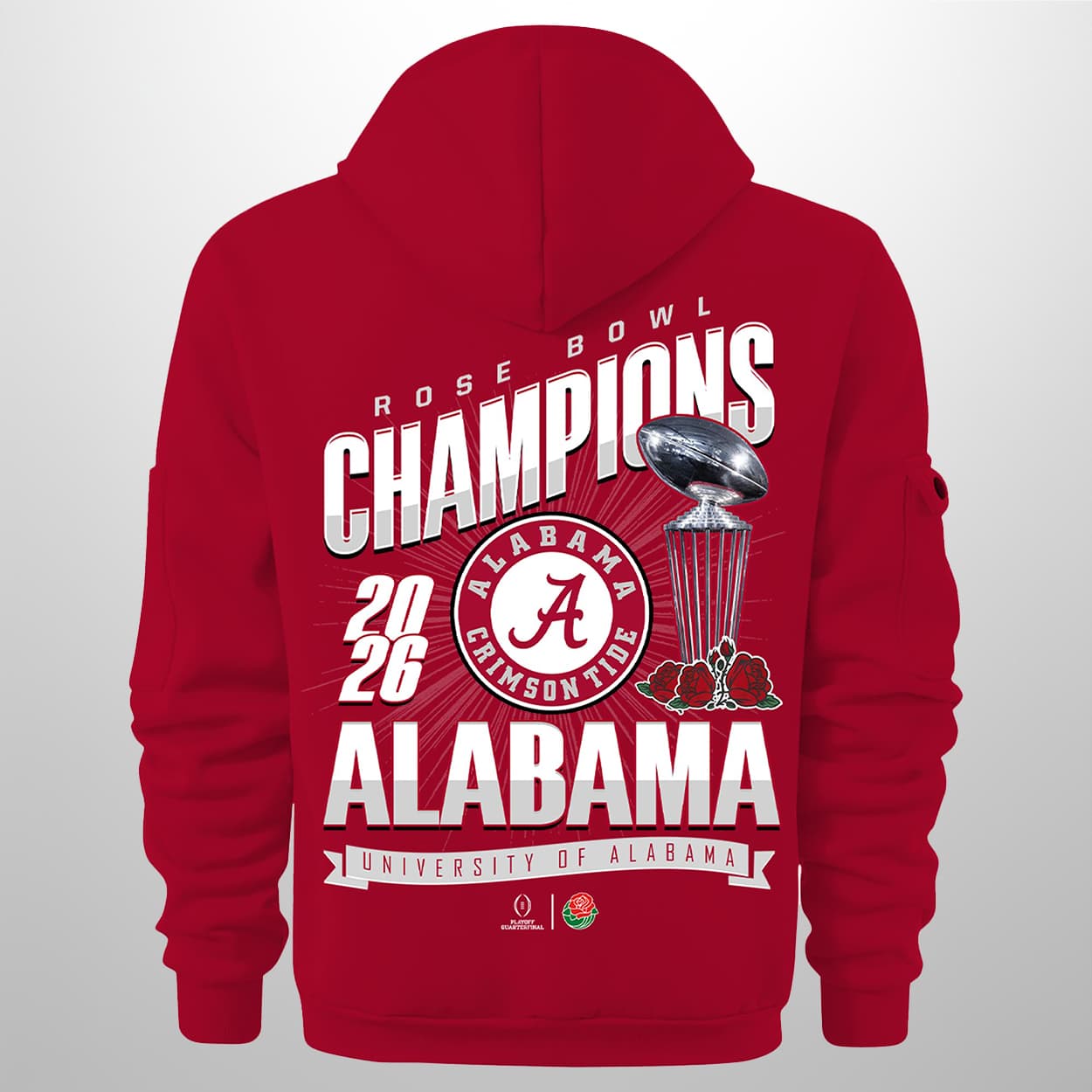 Turn heads and raise spirits with this hoodie—a tribute to Alabama’s flawless 15-0 season. The front boasts the proud “CHAMPIONS ROSE BOWL 2026” text, anchored by the fierce Alabama Crimson Tide logo and the iconic Rose Bowl emblem. Flip it around and you’ll find a victory parade in print: “ROSE BOWL CHAMPIONS 2026 ALABAMA,” crowned with the College Football Playoff National Championship trophy. It’s not just a hoodie—it’s a scoreboard you can wear.
