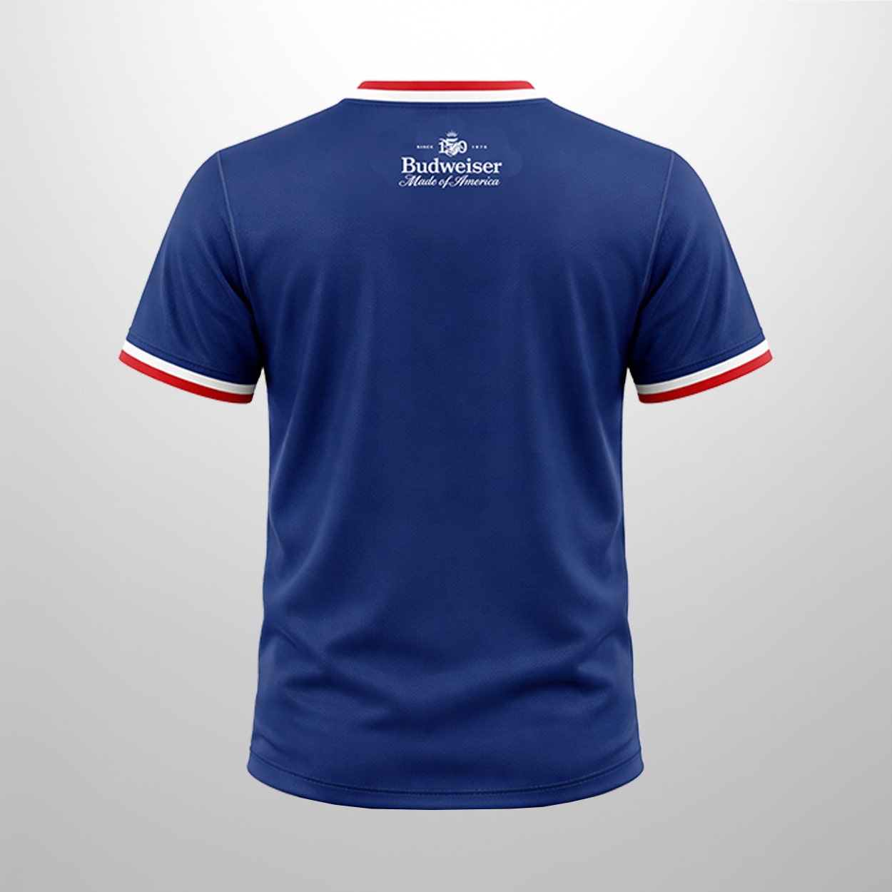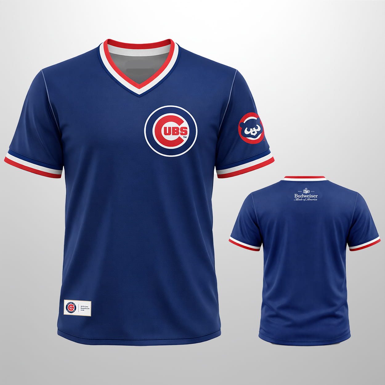 Relive the “Boys of Zimmer” era with this jersey. Drenched in a rich royal blue, the jersey features a sharp V-neck design accented by classic red and white stripes. The front proudly displays the iconic circular “UBS” logo, while the sleeve is adorned with the nostalgic “Angry Bear” patch. On the back, you’ll find the Budweiser 150th Anniversary commemorative logo, celebrating a century and a half of “The King of Beers” and its deep-rooted partnership with Chicago baseball.
