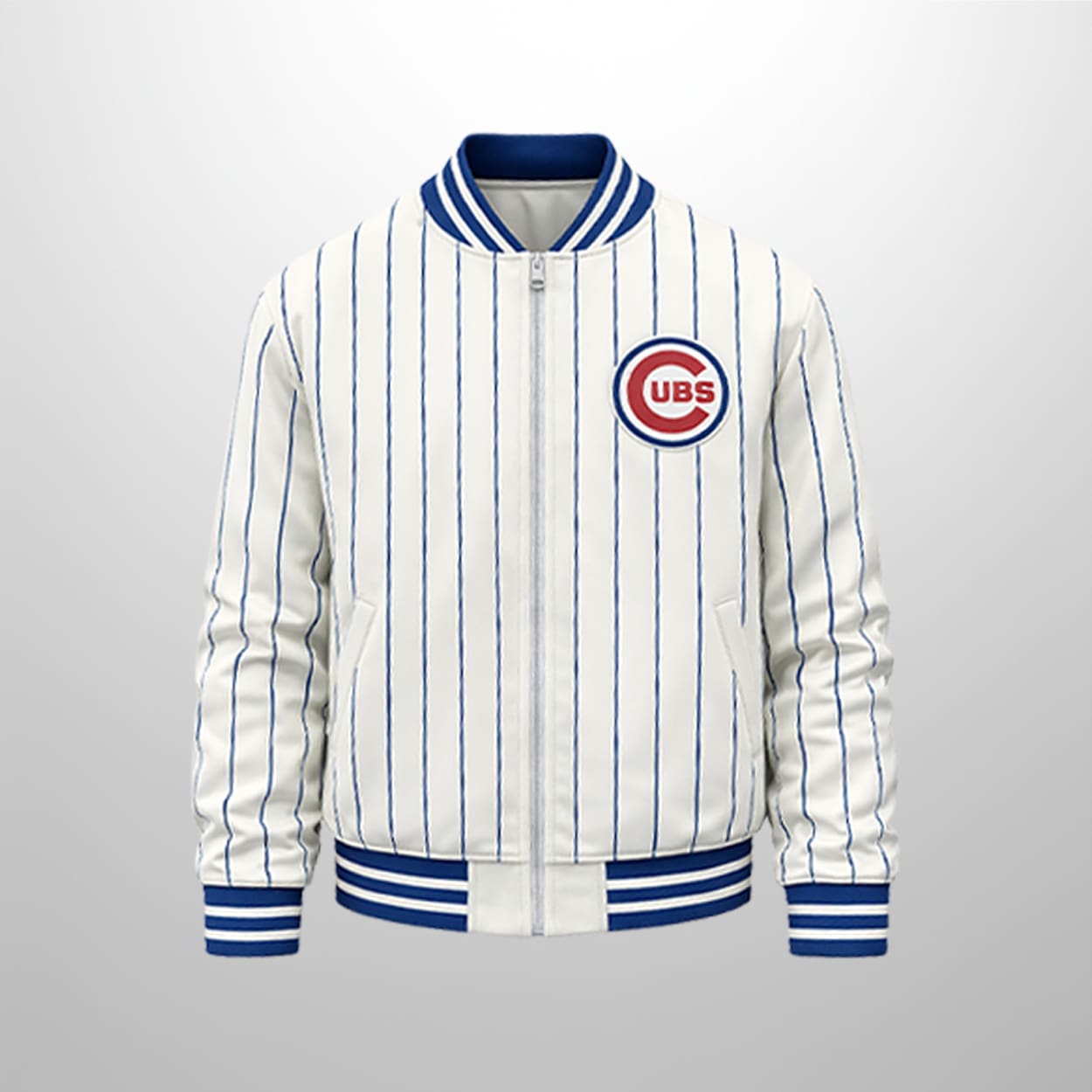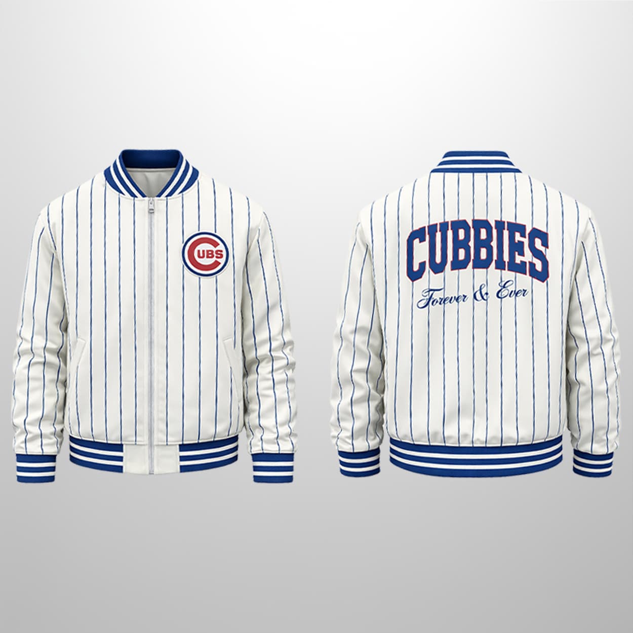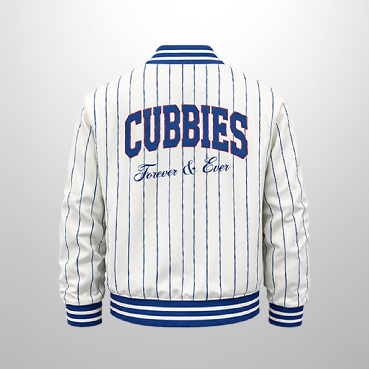 Step into Wrigleyville spirit with this jacket. This varsity-style jacket is a fan’s dream: crisp white with vertical blue pinstripes, a nod to the team’s timeless uniforms. On the front, the classic Chicago Cubs logo shines proudly on the chest, instantly recognizable with its red “C” encircling “UBS” in bold blue. The striped cuffs, collar, and waistband add a sporty finish, while the back steals the show with “CUBBIES” in oversized blue lettering, paired with the playful phrase “Forever & Ever” in cursive—a promise of loyalty that never fades.