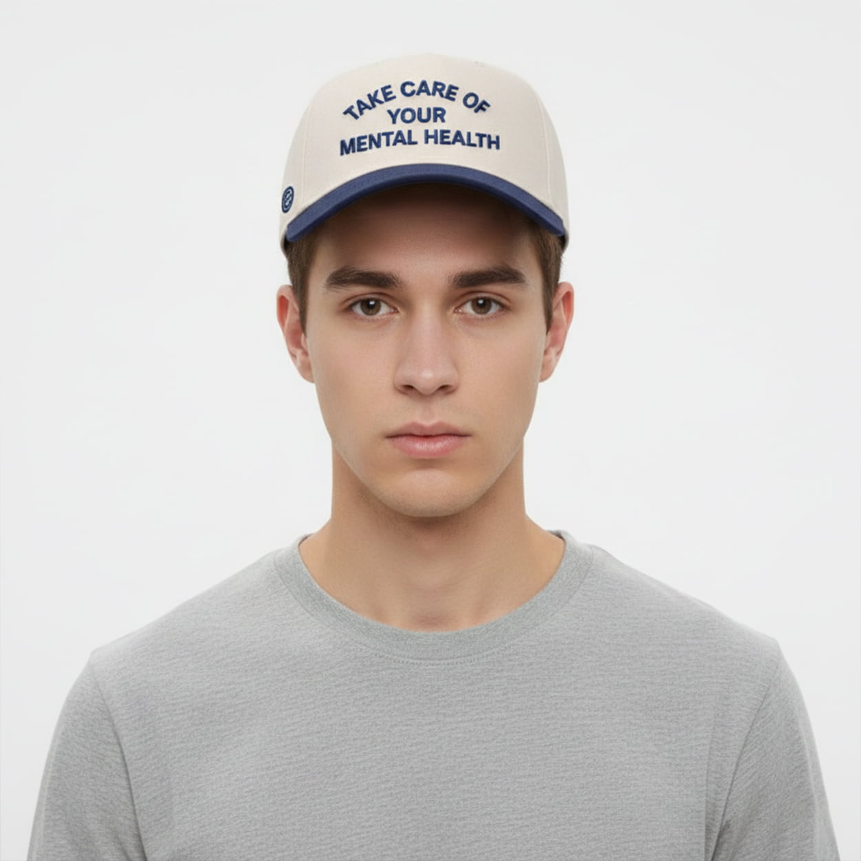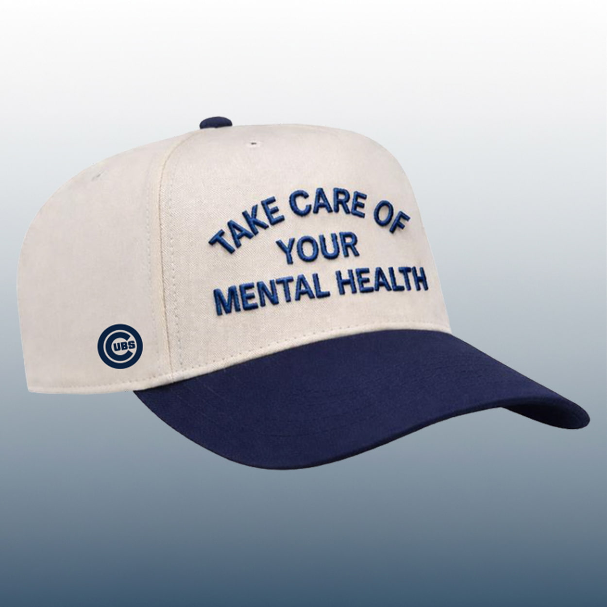 Step up to the plate for wellness with this cap. The cap features a clean, off-white crown contrasted by a deep navy blue brim and top button, creating a look that is as balanced as a perfectly thrown strike. Prominently displayed on the front is the uplifting message “TAKE CARE OF YOUR MENTAL HEALTH” in bold, navy blue block lettering that arches over the center. To round out the design, the classic Chicago Cubs “C” logo is subtly placed on the side, ensuring your team loyalty is always part of the conversation.