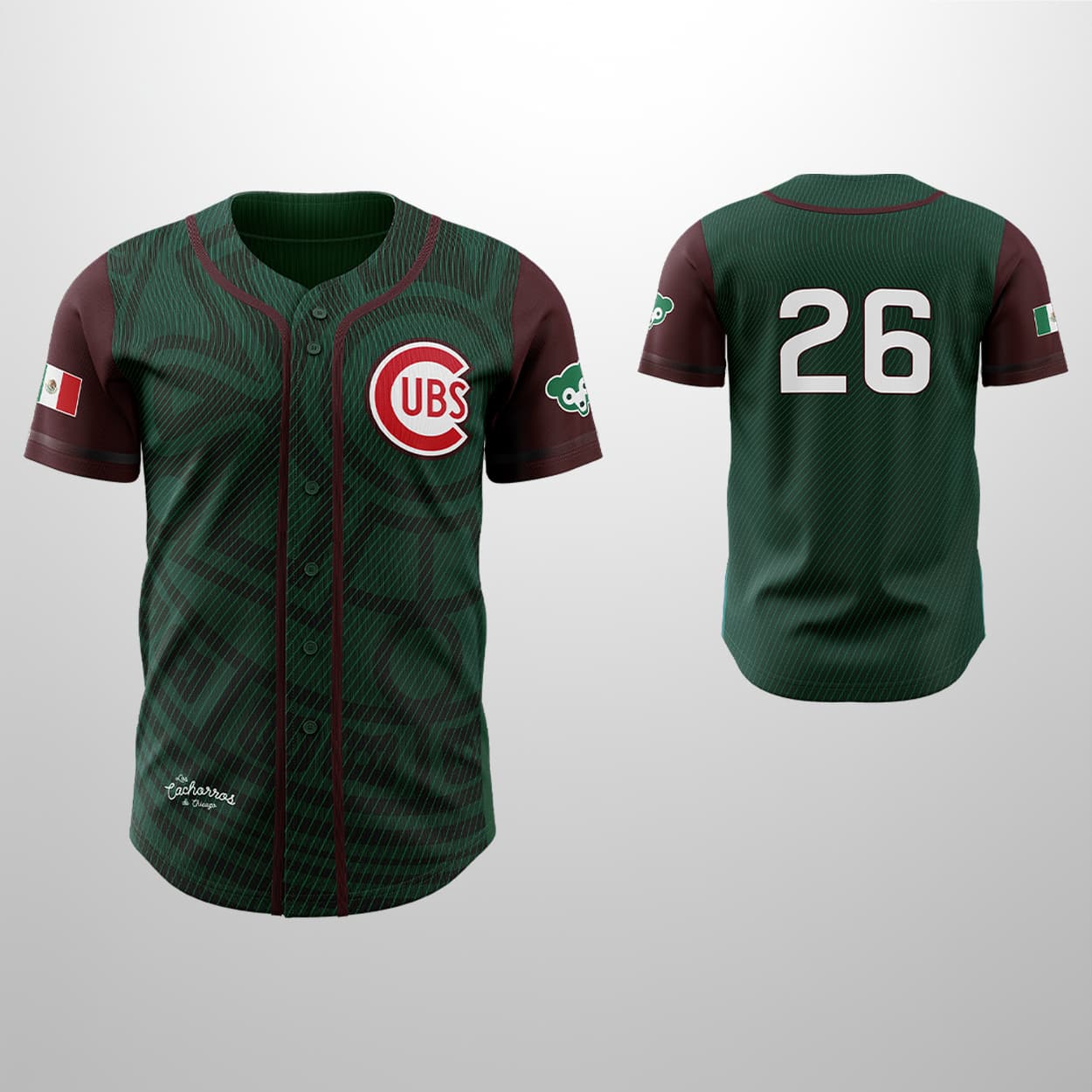 Step onto the field—or into the stands—with this jersey, an item that’s more than just fan gear. This jersey pops with maroon sleeves and fiery red accents, creating a look that’s both striking and timeless. The front proudly displays the “CUBS” logo on the left chest, while the sleeves feature meaningful patches: the Mexican flag on the right and a commemorative emblem on the left. Flip it around, and the bold white number “26” makes its mark on the back, ensuring you stand out from every angle.