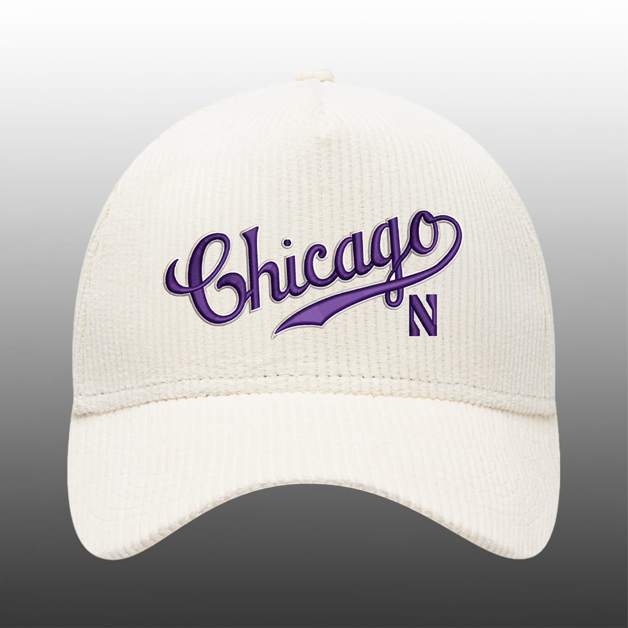 Get ready to storm the ivy with a cap that perfectly blends Evanston excellence with Wrigleyville tradition. This cap features a clean, off-white base that makes the vibrant purple accents truly pop. The front showcases “Chicago” in a classic, sweeping script, underscored by a sharp purple flourish and the iconic Northwestern “N” standing tall. The back features “CHICAGO CUBS” embroidered in matching purple above the adjustable snapback, ensuring your dual loyalty is clear from every angle in the bleachers.