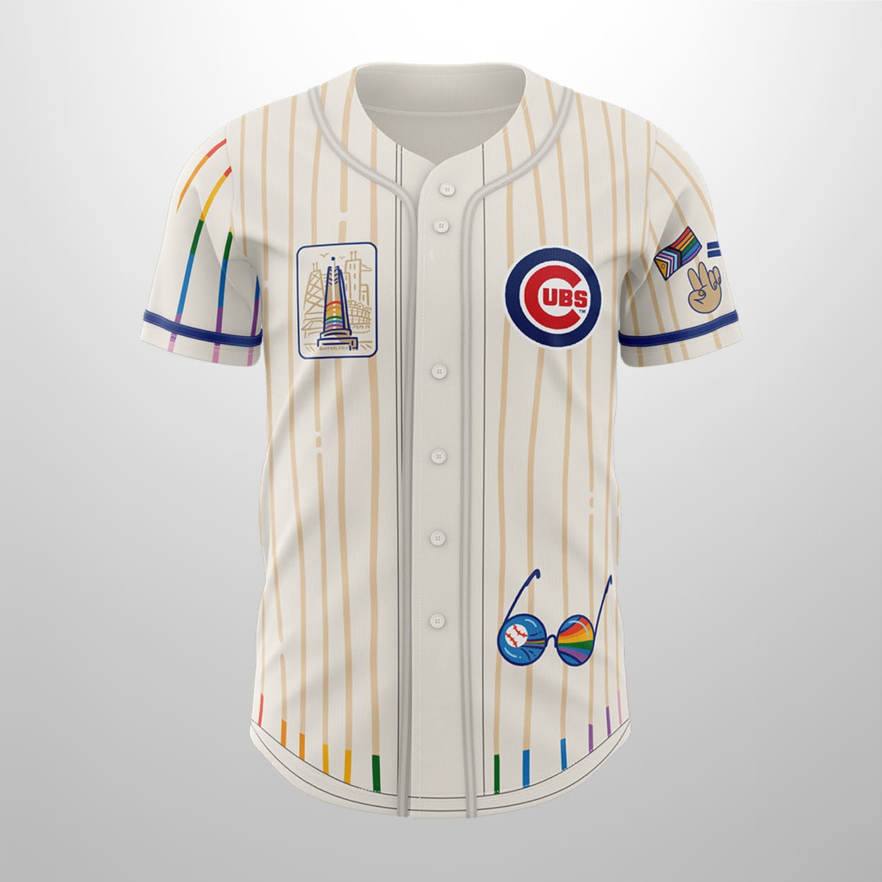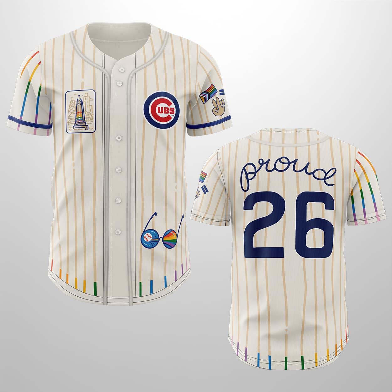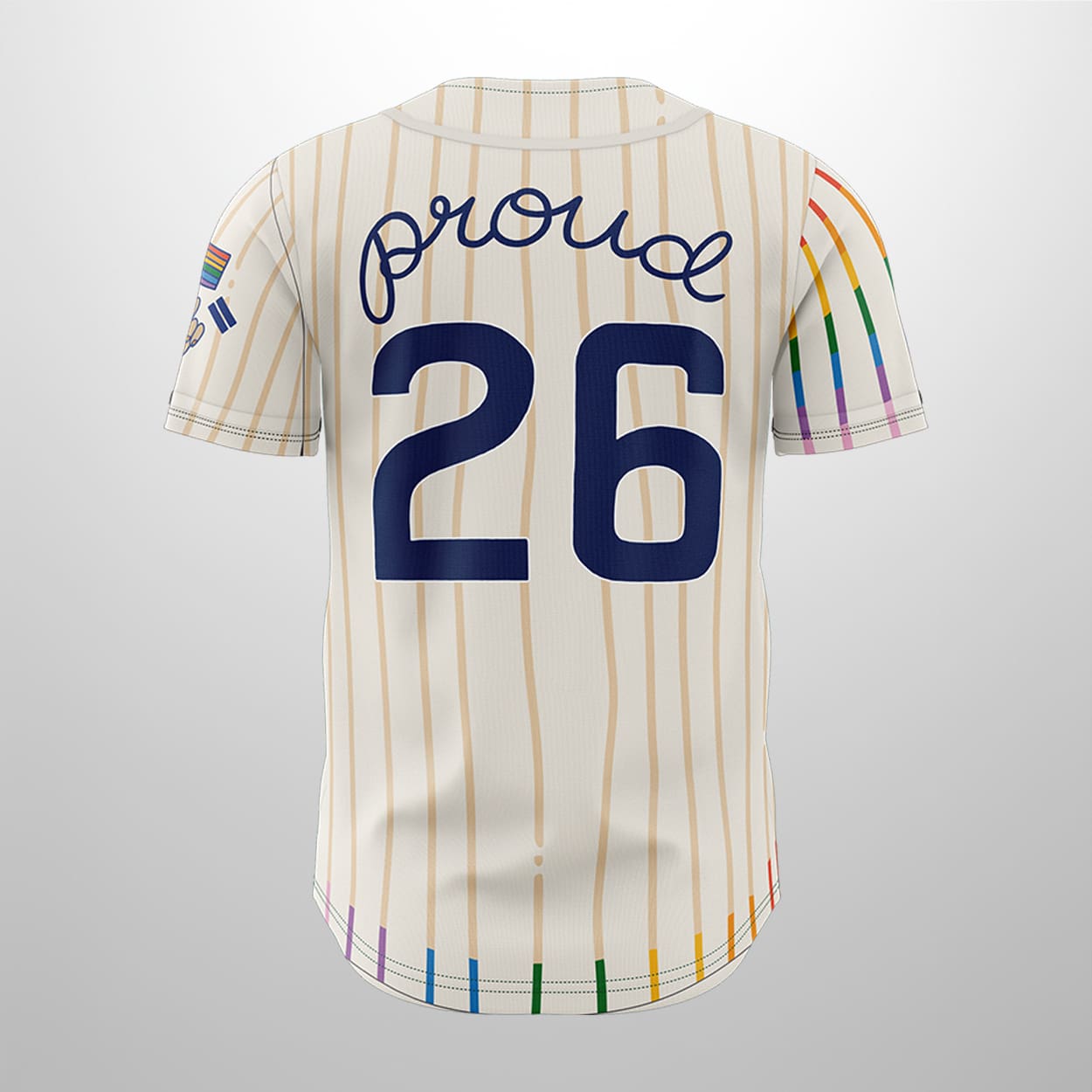 Step onto the Friendly Confines in style with this jersey. This cream-colored, pinstriped masterpiece is more than just fan gear; it’s a vibrant salute to the LGBTQ+ community. Featuring the classic Cubs “walking bear” logo on the chest, the jersey is transformed by a spectrum of rainbow accents along the hem and sleeves. From the artistic “Proud” script on the back to the playful sunglasses graphic on the front, every detail is designed to celebrate the beautiful diversity of the Cubs fan base during this year’s Pride Month festivities.