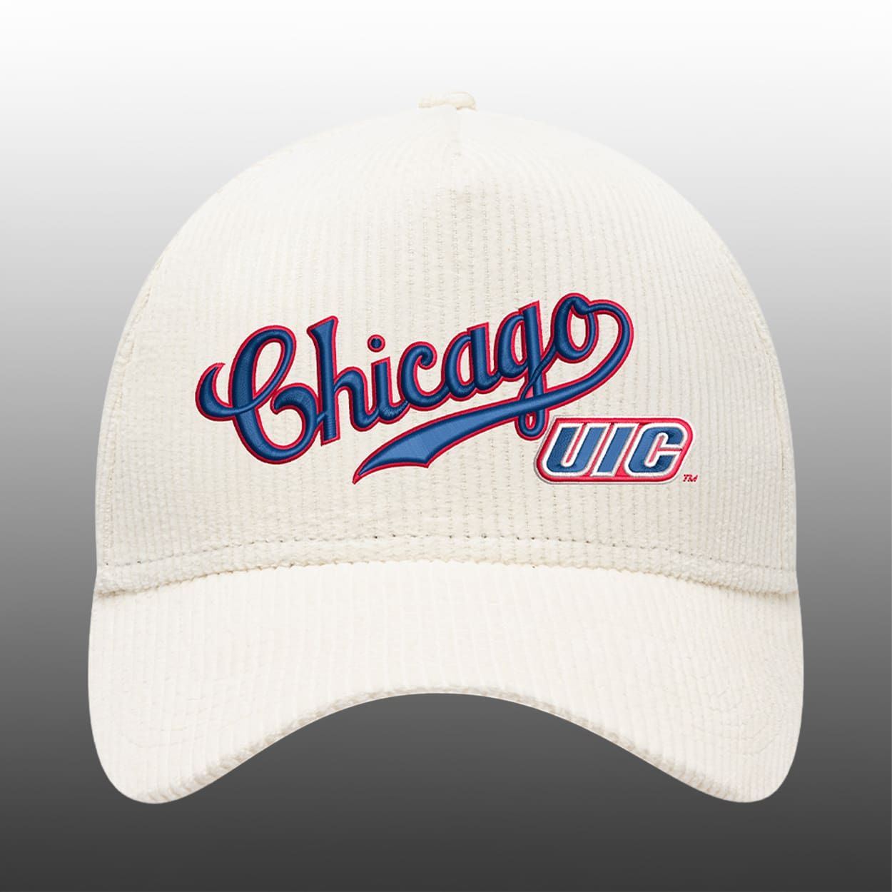 Step up to the plate with the most anticipated collegiate crossover of the season. This cap celebrates the high-energy synergy between the legendary Chicago Cubs and the University of Illinois Chicago. Set against a clean, crisp ivory backdrop, the front of the cap features a dynamic “Chicago” script in deep blue and vibrant red that flows with the grace of a walk-off home run. Nestled perfectly beneath the tail of the script is the bold UIC logo, creating a “double play” of academic excellence and athletic heritage. For the finishing touch, the back displays “CHICAGO CUBS” in classic block lettering, ensuring your loyalty is visible from every angle.