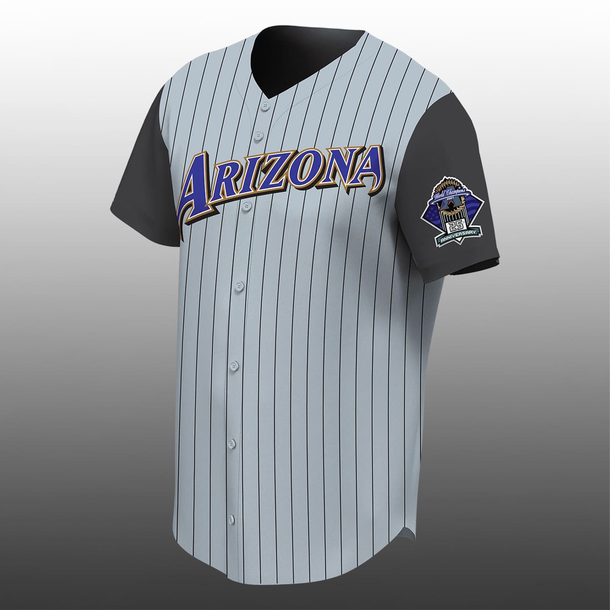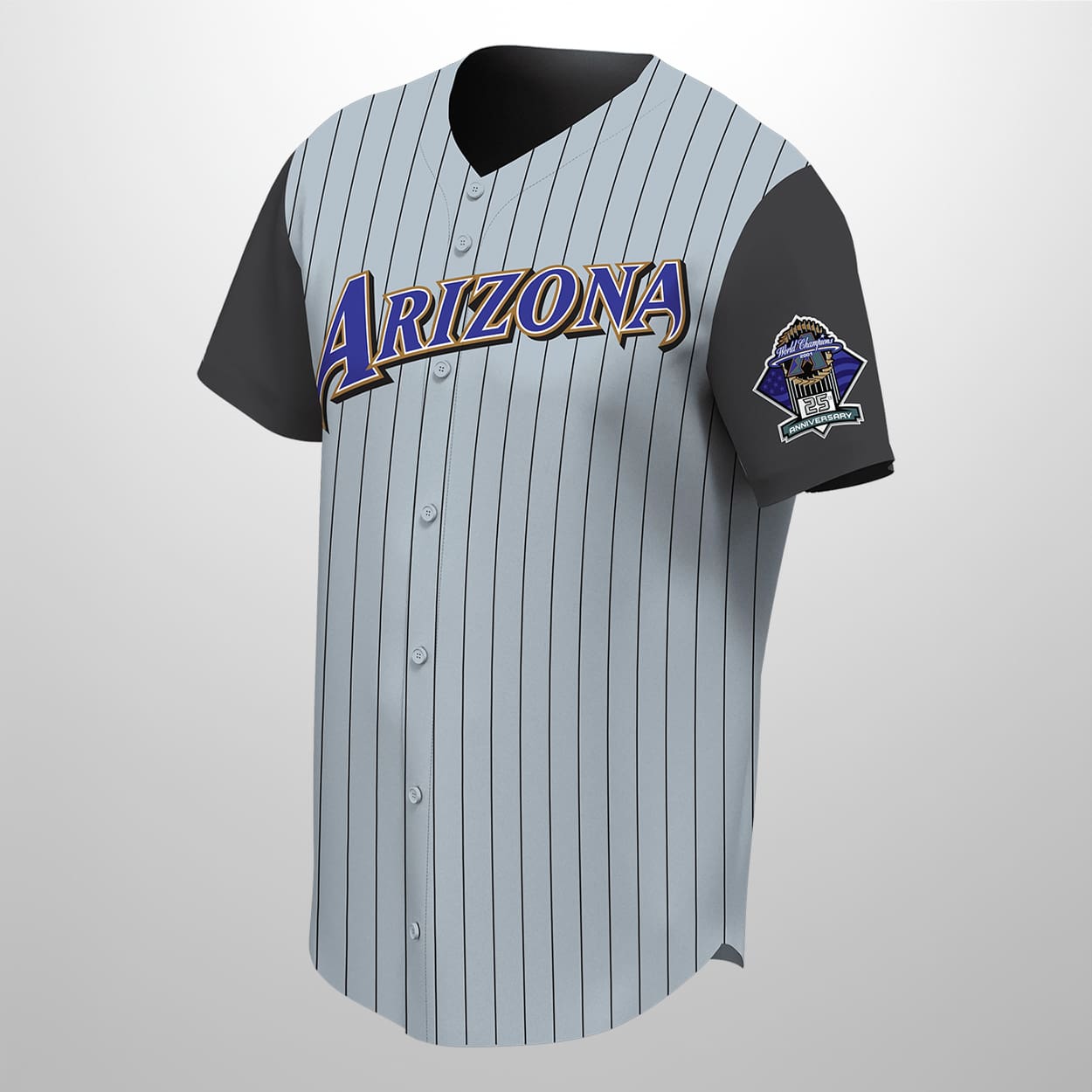 This jersey is a nostalgic tribute to the golden era of Arizona baseball. This jersey piece features a classic grey base accented by sharp, vertical black pinstripes that evoke the grit of the early 2000s road games. The front is headlined by the iconic “ARIZONA” wordmark, rendered in a striking purple with a bold gold outline that pops against the muted fabric. Designed with sleek charcoal sleeves, this jersey balances vintage flair with a clean, modern silhouette perfect for a night at Chase Field or a casual day in the Valley.