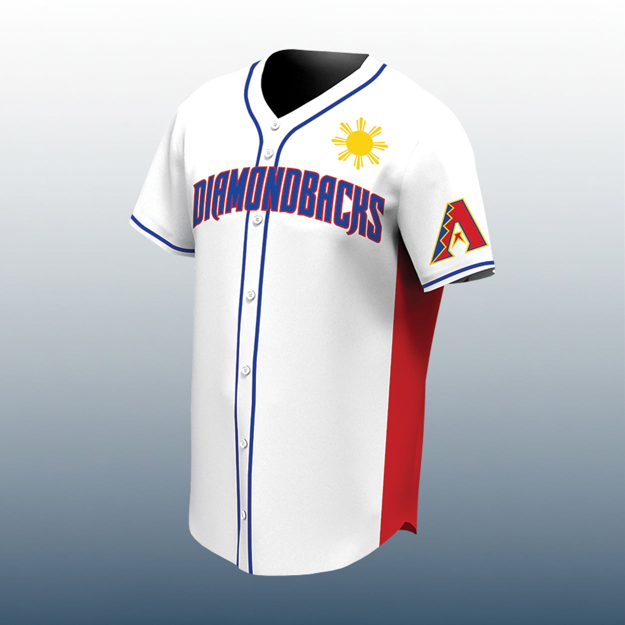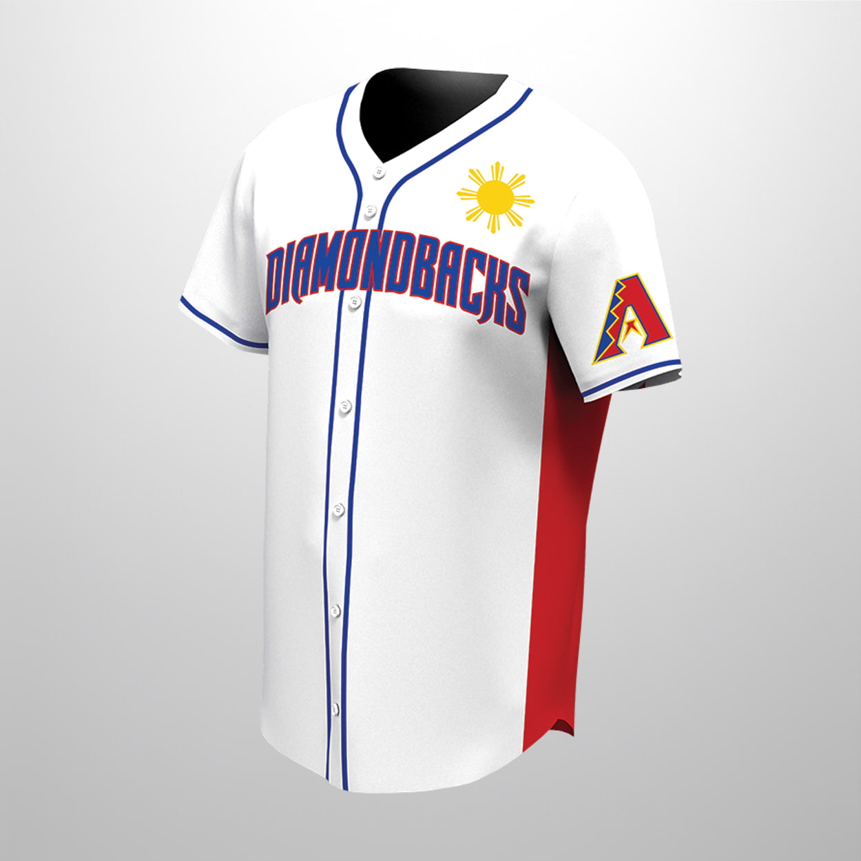The Diamondbacks are bringing heritage to the diamond with a jersey that shines as brightly as the desert sun. This jersey features crisp white with striking blue piping along the button line and collar. Across the chest, “DIAMONDBACKS” is displayed in stylized blue and red lettering, a nod to vibrant Filipino colors. Above the team name sits a radiant yellow sun, echoing the iconic symbol from the flag of the Philippines. Red side panels add a bold contrast, while the left sleeve proudly carries the Diamondbacks’ signature “A” logo with its snake tongue design.