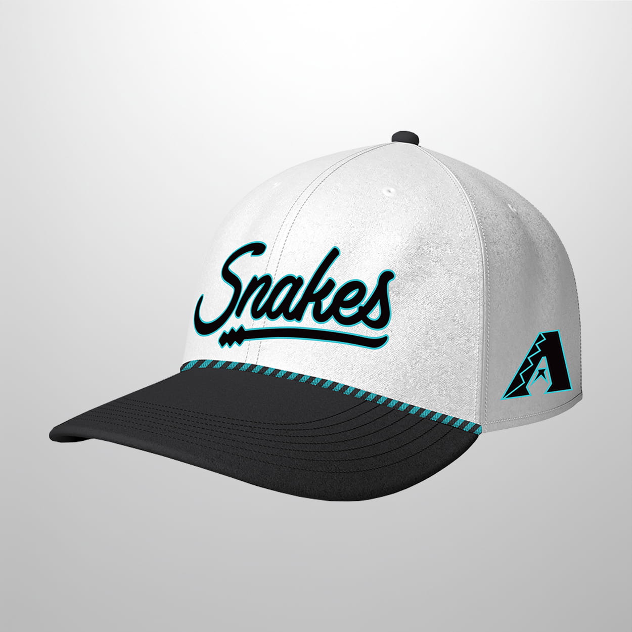 The Diamondbacks are serving up a fresh look with this cap. This cap sports a crisp white crown paired with a sharp black brim, giving it a clean yet striking contrast. Across the front, the word “Snakes” is embroidered in a playful cursive font, outlined in teal for a pop of color. A zigzag teal trim runs along the brim’s edge, adding a dynamic touch that feels both sporty and stylish. On the side, the iconic “A” logo cleverly entwined with a snake design completes the look, tying the cap back to the team’s fierce identity.