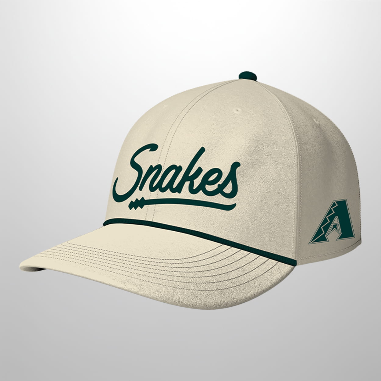 This cap is a fresh take on Diamondbacks spirit, designed to stand out both on the course and in the stands. The crown features the word “Snakes” in a flowing cursive script, a nod to the team’s nickname and its slithering swagger. Dark green accents highlight the brim with sleek lines along the edge and above, giving the cap a sporty, polished look. On the side, the stylized “A” logo—crafted with a snake motif—anchors the design, tying back to the team’s identity with a bold, unmistakable mark.