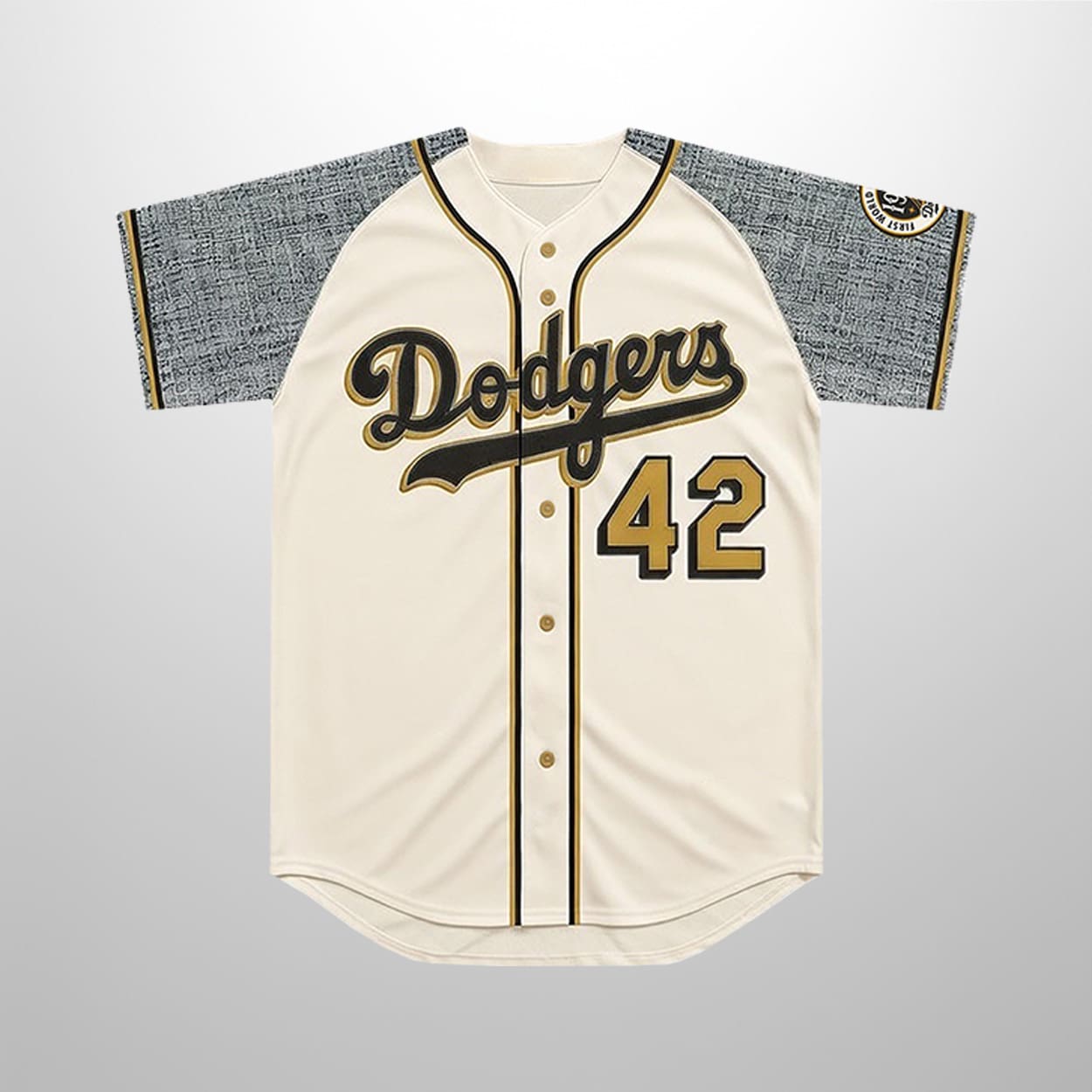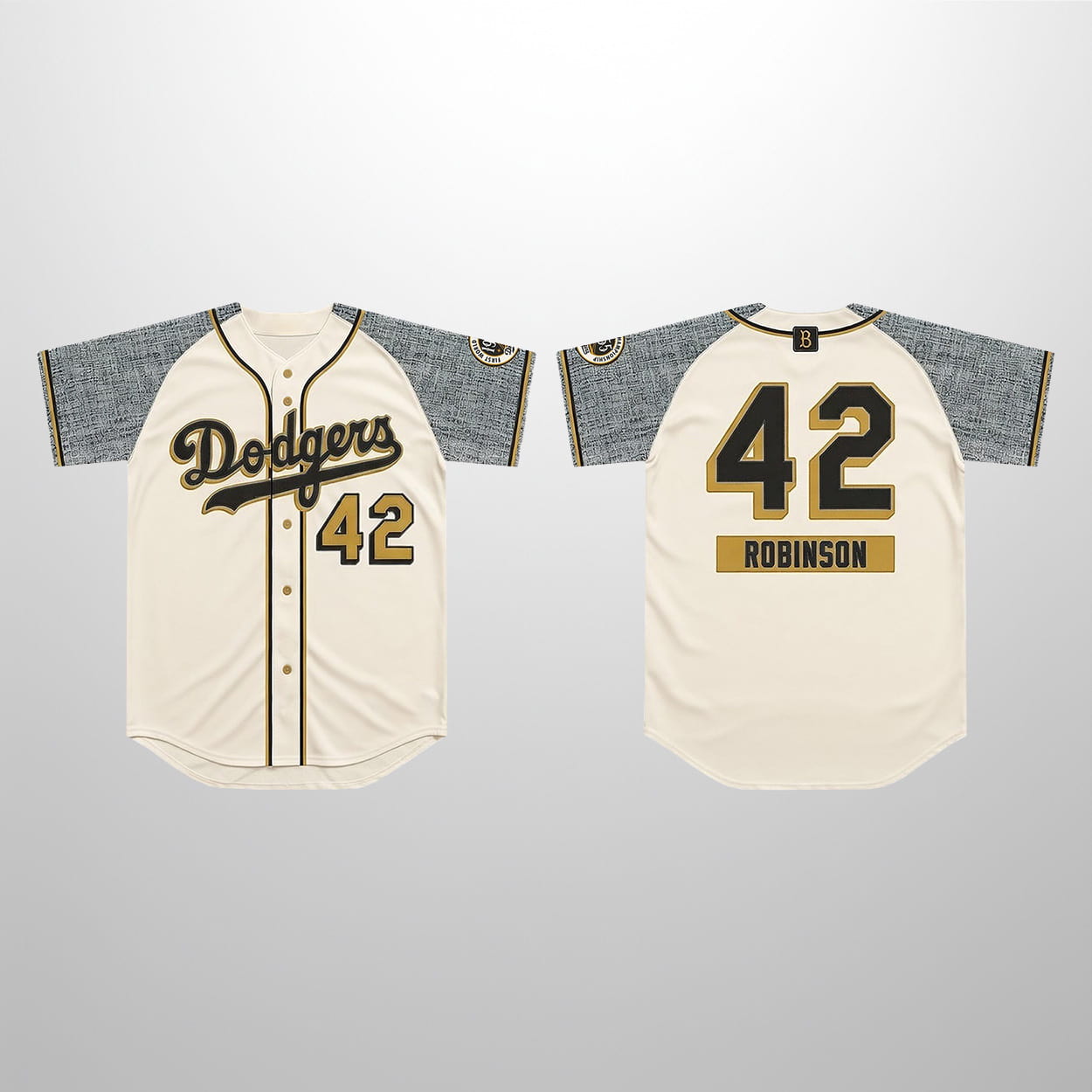 Jackie Robinson’s number 42 is more than digits—it represents breaking barriers and reshaping the game forever. The bold black and gold styling reflects strength and resilience, while the cream base and patterned sleeves add a modern twist to a classic tribute. This jersey is designed for fans who not only celebrate the Dodgers but also honor Robinson’s trailblazing spirit. It’s a statement piece for those who believe sports can inspire change and who proudly carry that message forward.