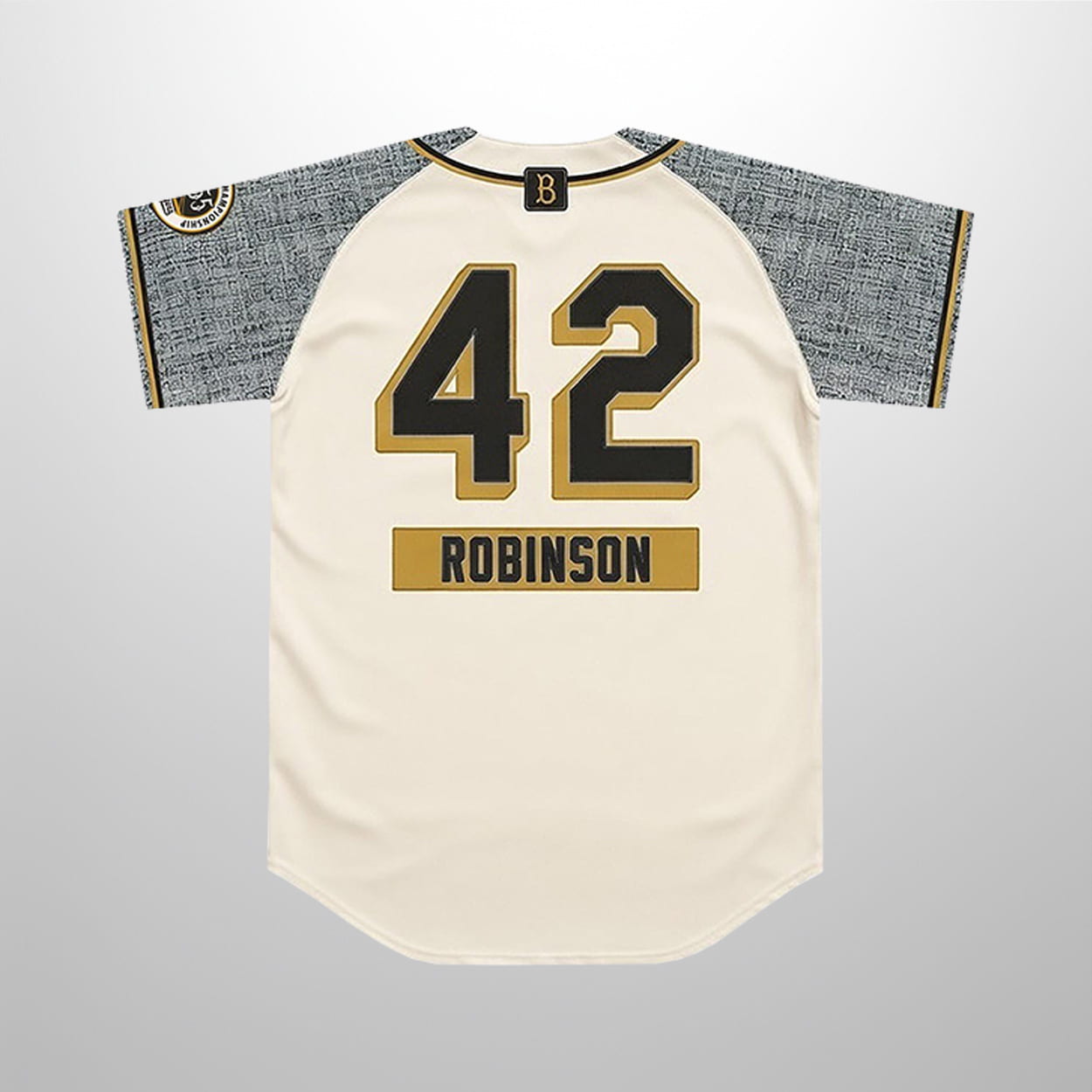 This jersey is a tribute to one of the most important figures in sports history. Cream-colored with gray patterned sleeves, the jersey features sleek black and gold accents that elevate its commemorative look. Across the chest, “Dodgers” is written in a stylized script, paired with the number “42” on the lower right side. On the back, Robinson’s name is displayed beneath the large, striking “42,” ensuring fans carry his legacy wherever they go. This jersey is more than apparel—it’s a symbol of courage, progress, and pride.