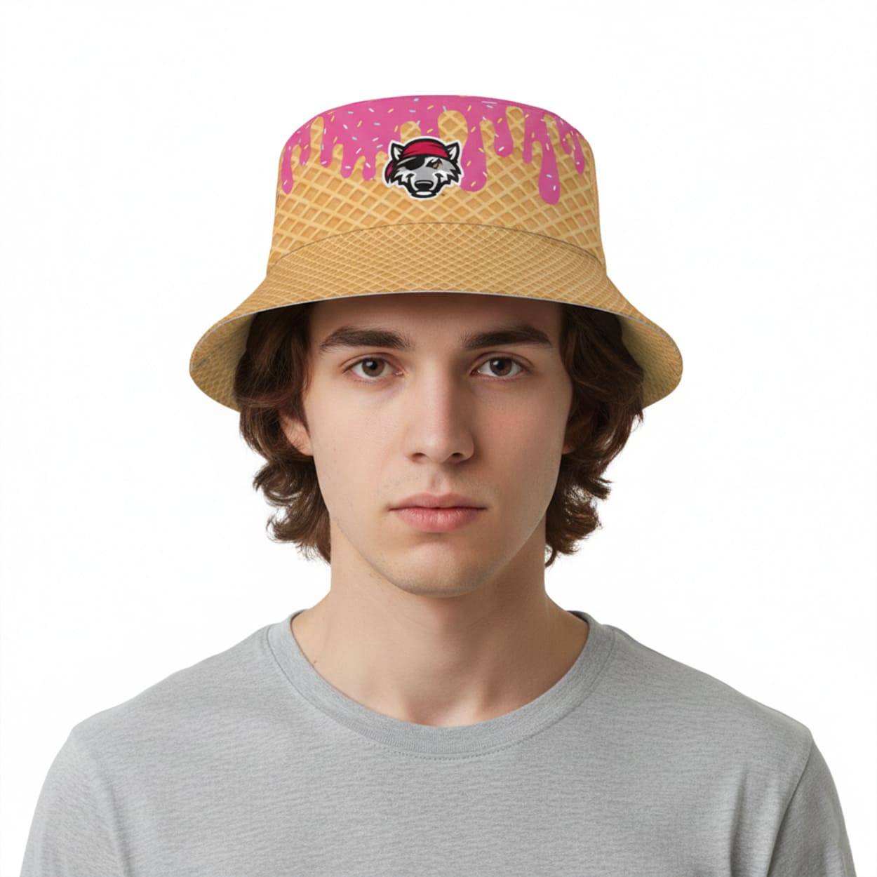 This hat is a treat for fans who crave something bold and unforgettable. This bucket hat is designed to look like a delicious ice cream cone: the lower half features a waffle cone pattern, while the top bursts with pink icing dripping down, sprinkled with colorful accents to mimic melting ice cream. At the center sits the SeaWolves’ iconic logo—a stylized wolf head rocking a red cap—adding a fierce edge to the playful design. It’s a cap that blends whimsy with team pride, making it a standout accessory for game day and beyond.