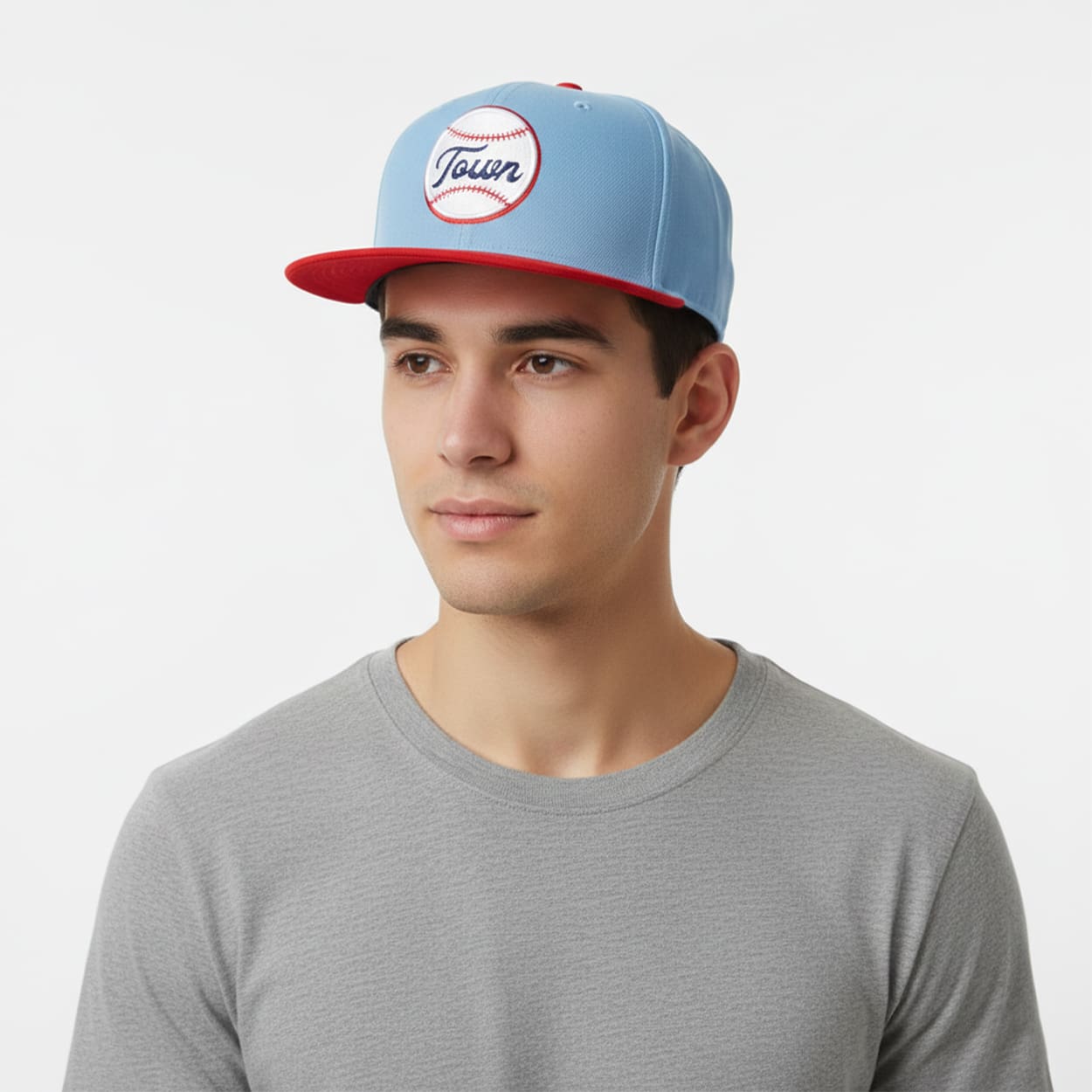 Step up to the plate with this hat. This eye-catching cap features a light blue crown paired with a fiery red brim and top button, creating a color combo that screams team spirit. Front and center is a crisp white baseball graphic with red stitching, boldly stamped with the word “Town” in vintage-style cursive. It’s sporty, nostalgic, and unmistakably Philly—perfect for fans who live and breathe the game.