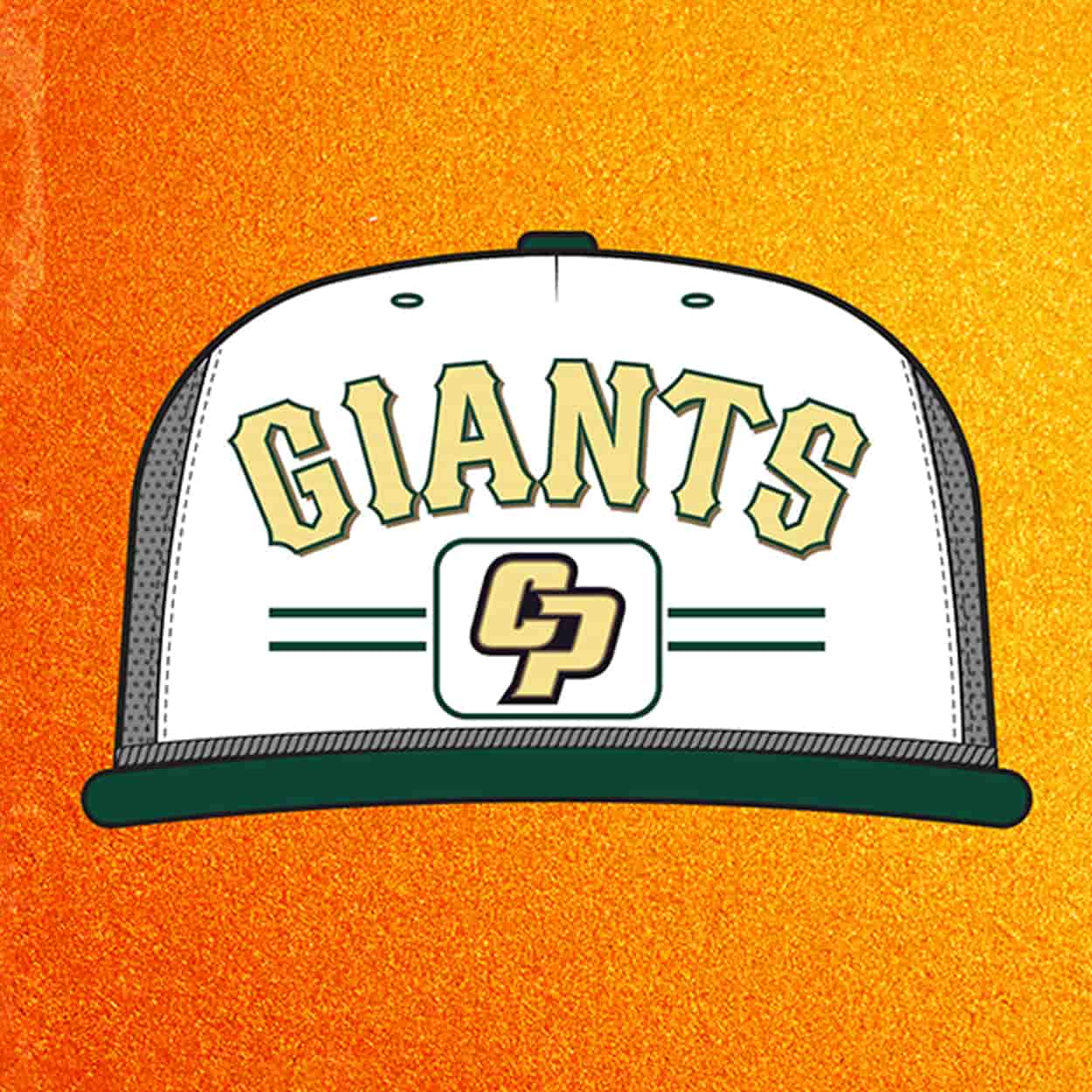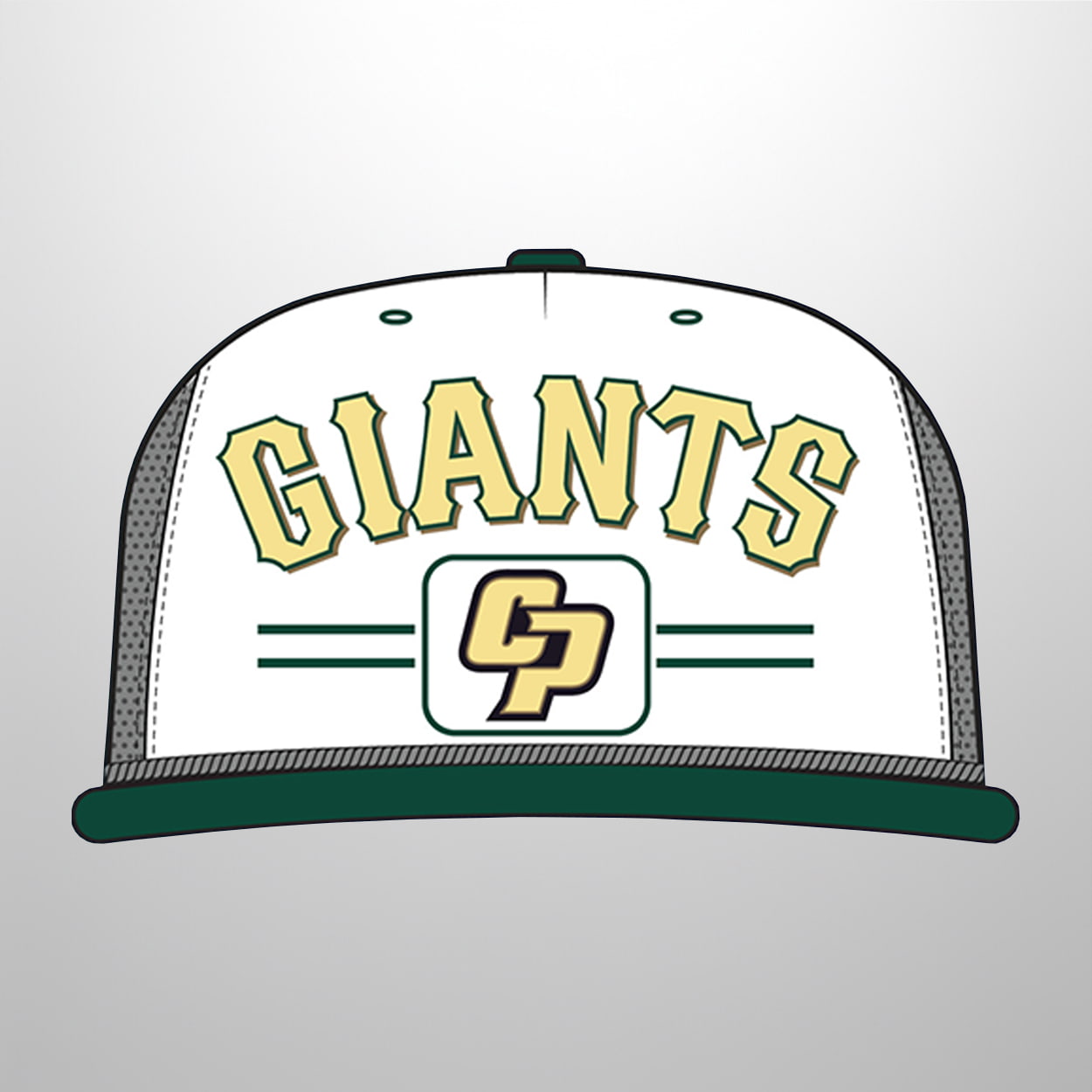 This hat is a head-turning tribute to fans who rep both the diamond and the classroom. This crisp white and green cap features “GIANTS” in oversized, stylized yellow letters outlined in green across the front—loud, proud, and unmistakably bold. Just below, a standout logo showcases the letters “CP” in yellow with a black outline, framed in a white box with green borders and flanked by two sleek green lines. The green brim and roped detailing add a retro twist, while the mesh sides keep things cool and classic.