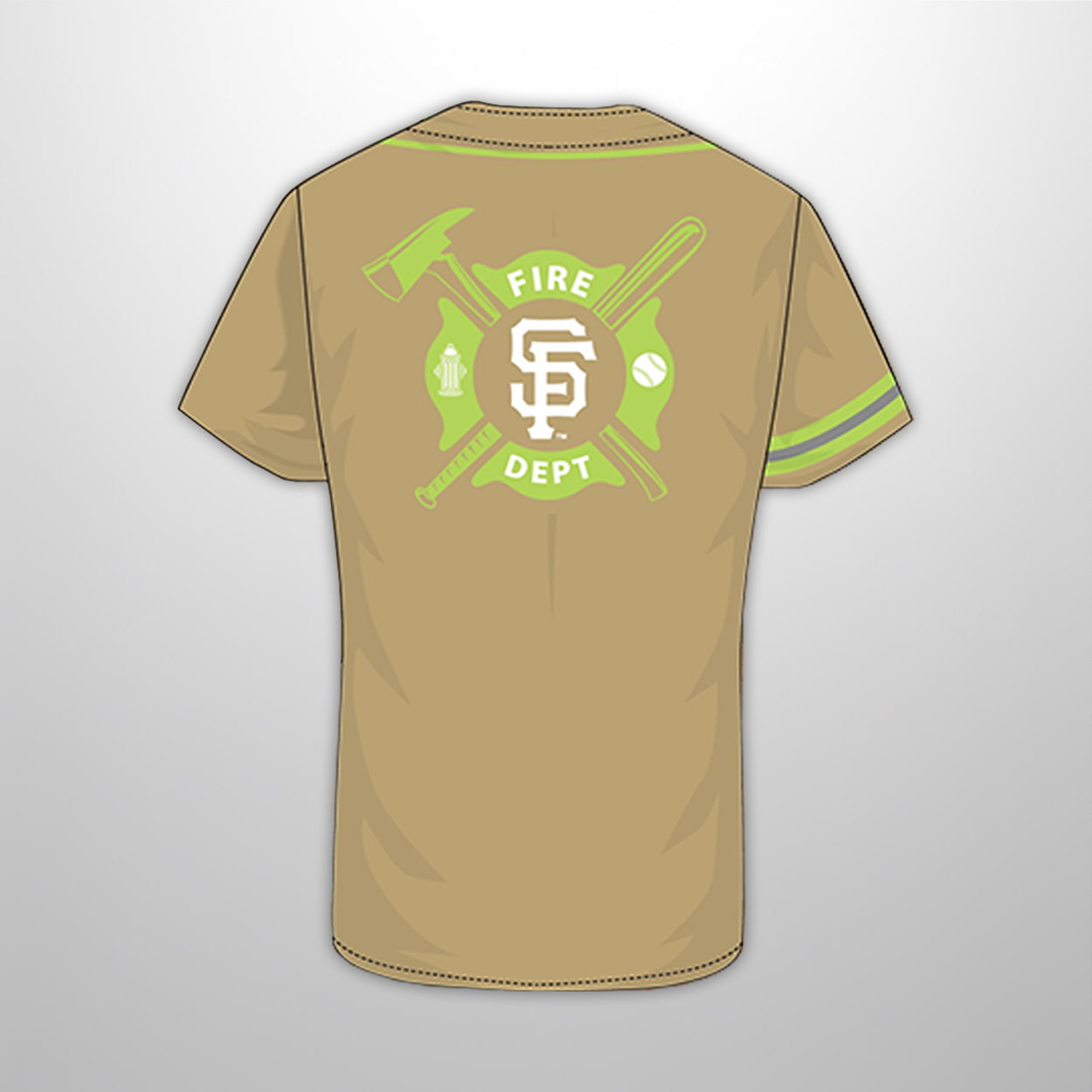 Get ready to turn heads at the ballpark with this jersey! This tan-colored stunner is anything but ordinary. Splashed across the chest in electrifying neon green, the word “GIANTS” pops with pride and energy. But the real showstopper is on the back: a fierce graphic featuring crossed fire axes, a classic fire helmet, and the bold “SF” emblem encircled by “FIRE DEPT.” It’s a wearable salute to the fearless firefighters who keep San Francisco safe—and a must-have for fans who love a little extra flair with their fandom.