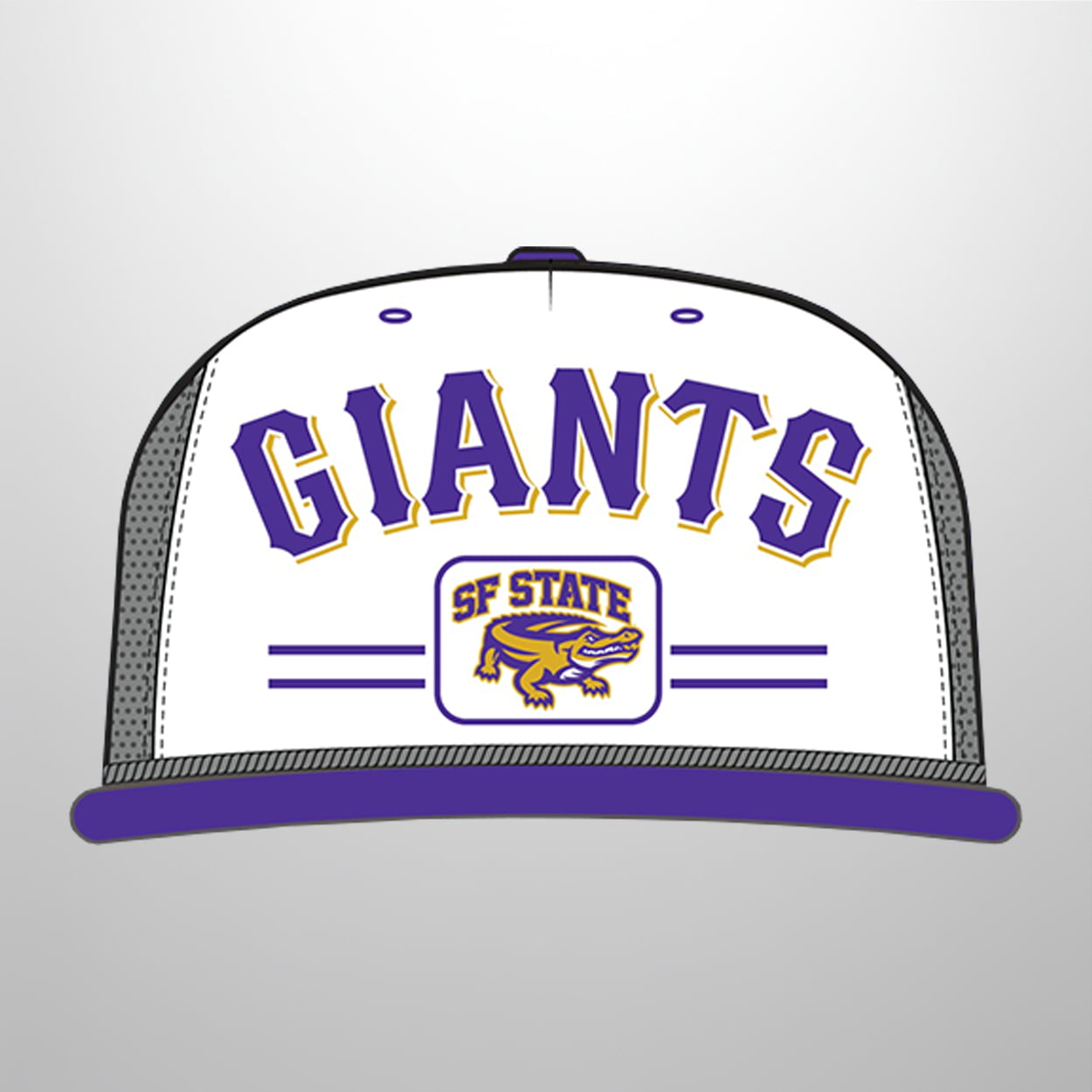 The design is a masterclass in playful school spirit. Front and center, the legendary “GIANTS” text is reimagined in SF State’s signature purple and gold, creating a seamless fusion of team and school identity. Beneath the main text sits a framed badge showcasing the university’s beloved Gator mascot, appearing ready to snap up a victory.