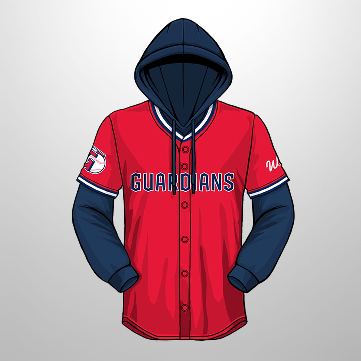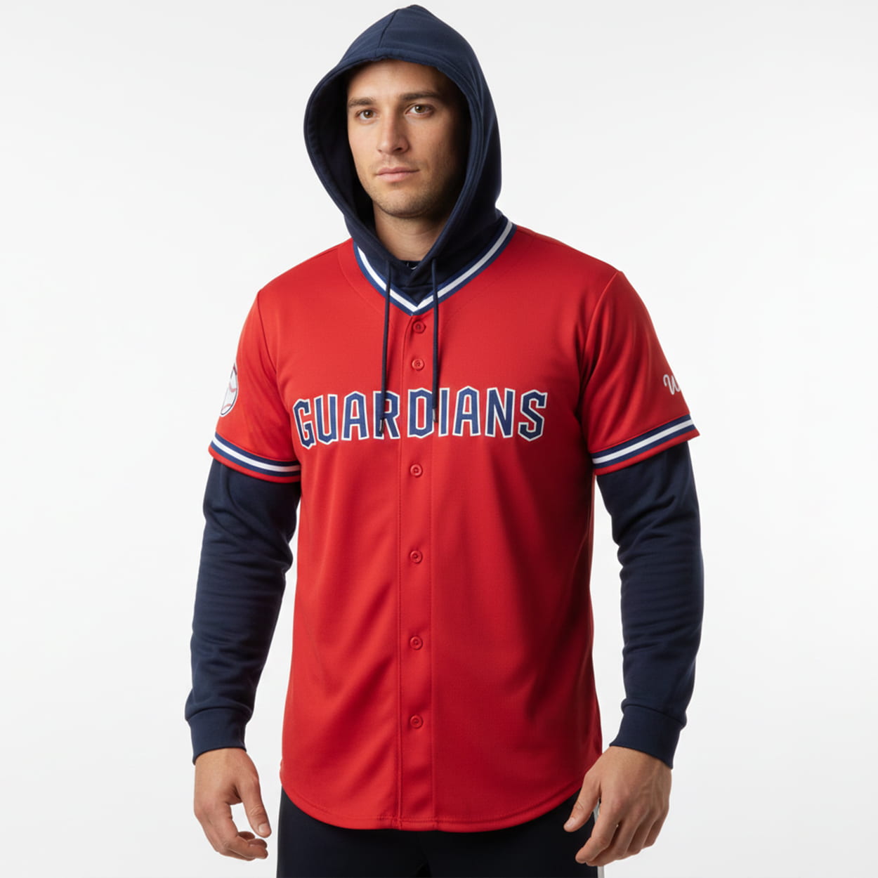 The Guardians are stepping up fan gear in 2026 with this jersey hoodie, a design that blends the timeless look of a baseball jersey with the comfort of a hoodie. The front proudly displays “GUARDIANS” in bold uppercase letters across a vibrant red body, accented by navy sleeves and hood. Button detailing down the front adds a nod to traditional jersey styling, while crisp white and blue striping around the collar and cuffs brings extra flair.