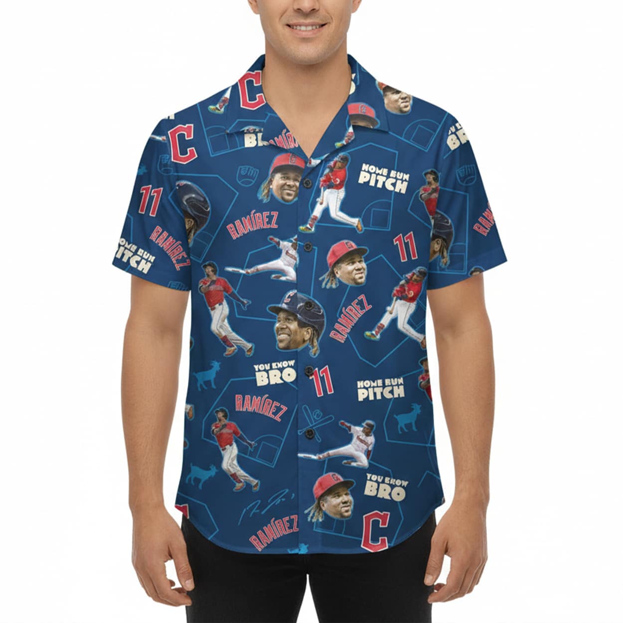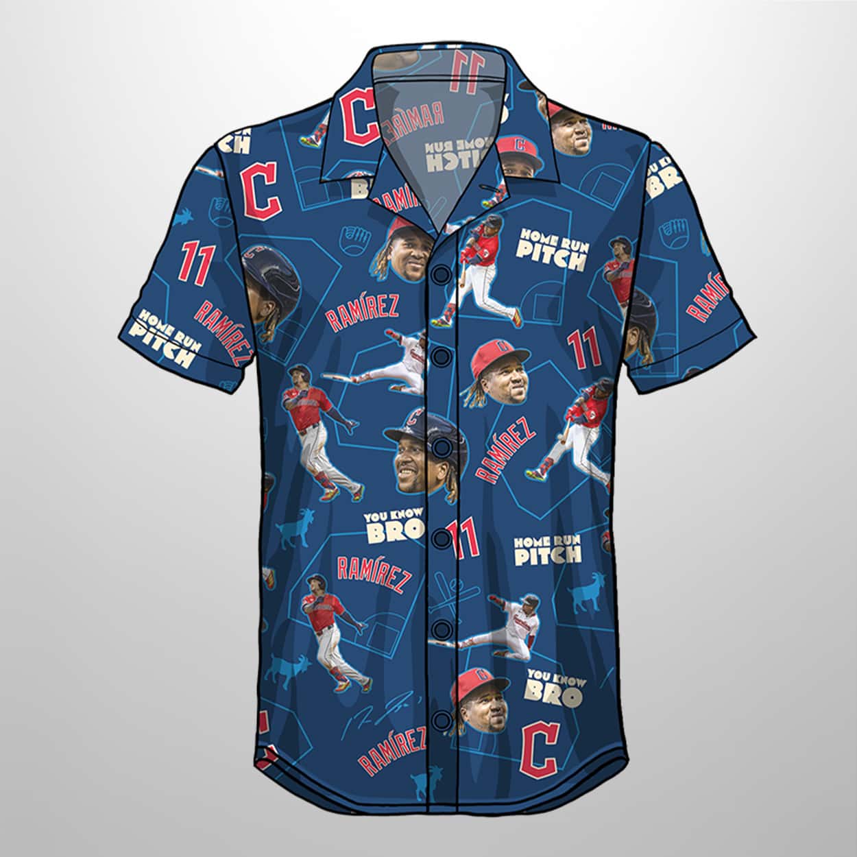Step up to the plate with the ultimate fan collectible! This short-sleeved button-up bursts with vibrant blue, red, and white accents, showcasing Ramírez in dynamic action poses: pitching, batting, and staring down the competition with confidence. The shirt is splashed with playful text like “HOMW RUN PITCH,” and Ramírez’s iconic number 11. The bold “C” logos scattered across the design proudly represent the Cleveland Guardians, making this shirt a must-have for fans who want to wear their team pride loud and clear.