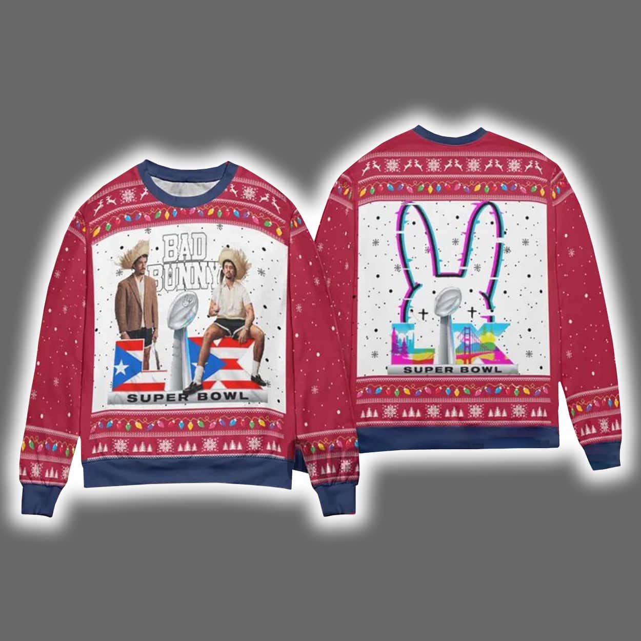 Turn heads and spark conversations with this electrifying tribute to the 2026 Super Bowl Halftime Show. The front of the sweater showcases a vivid image of Bad Bunny seated beside another mystery guest. Puerto Rican flags wave proudly in the design, celebrating Bad Bunny’s roots, and the red backdrop sprinkled with snowflakes adds a cheeky holiday twist. Flip it around and you’ll find a rainbow-outlined bunny silhouette with “SUPER BOWL” beneath—because even the back deserves a mic-drop moment.