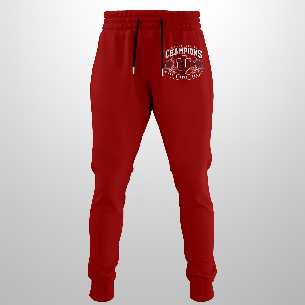 Turn heads and relive the glory with this combo—a triple-threat tribute to Indiana’s epic win. The hoodie roars with pride: “INDIANA HOOSIERS CHAMPIONS ROSE BOWL GAME” wrapped around the IU logo and flanked by two bold red roses. The back? A full celebration with “ROSE BOWL CHAMPIONS 2026 INDIANA UNIVERSITY,” the trophy, and logos that seal the deal. The joggers keep the energy alive with matching thigh graphics, while the cap crowns your look with “CHAMPIONS” front and center, roses blooming beside the IU emblem. It’s a full-body flex of Hoosier dominance.