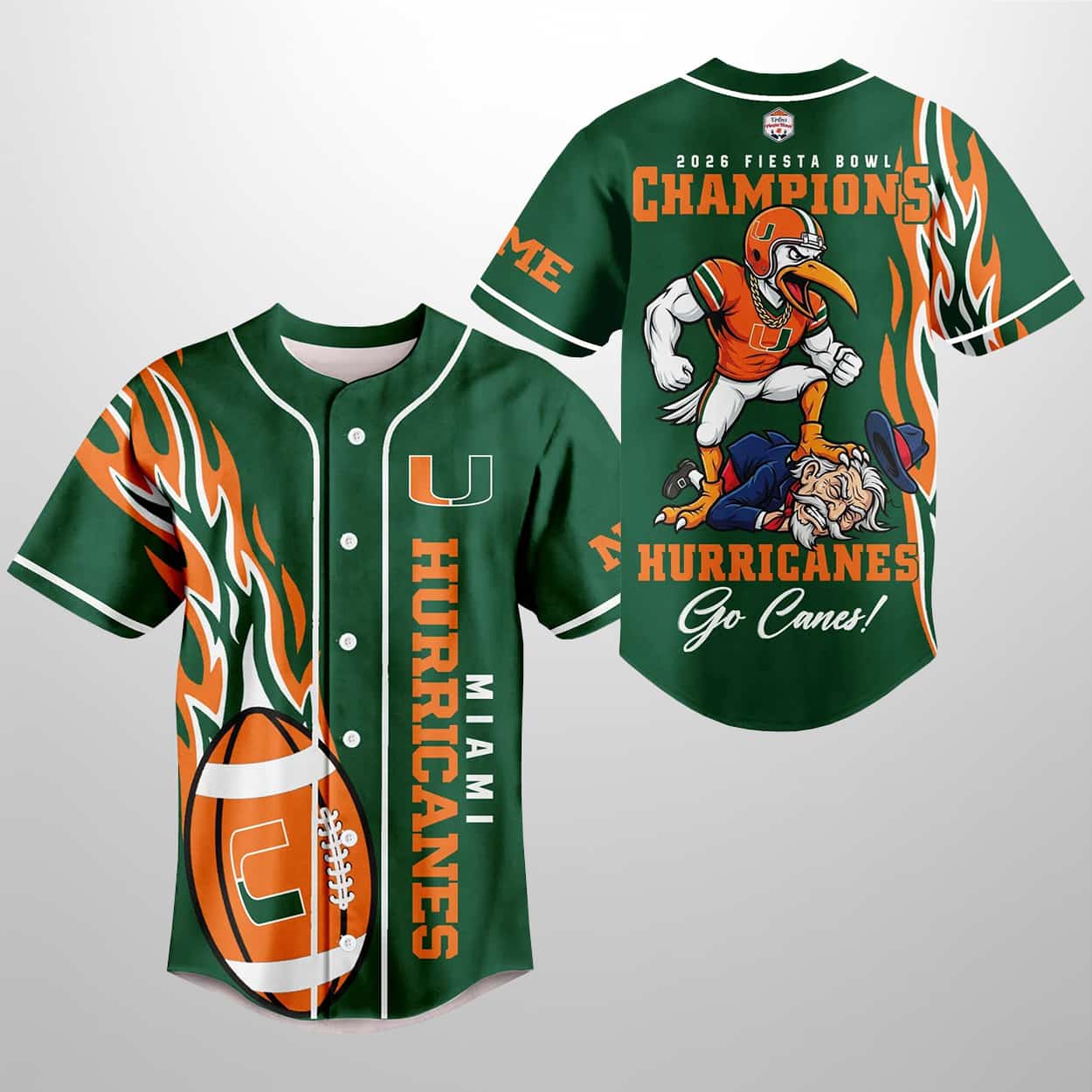 Turn heads and spark conversations with this jersey, a tribute to triumph and team pride. This vibrant green jersey is electrified with orange and white accents, featuring a flaming football emblazoned with the iconic “U” logo front and center. Along the right side, “MIAMI HURRICANES” runs vertically in bold lettering, while crisp white buttons and piping add a classic touch. On the back, the celebration continues with “2026 FIESTA BOWL CHAMPIONS” proudly displayed above a victorious Hurricanes mascot standing over a defeated rival.