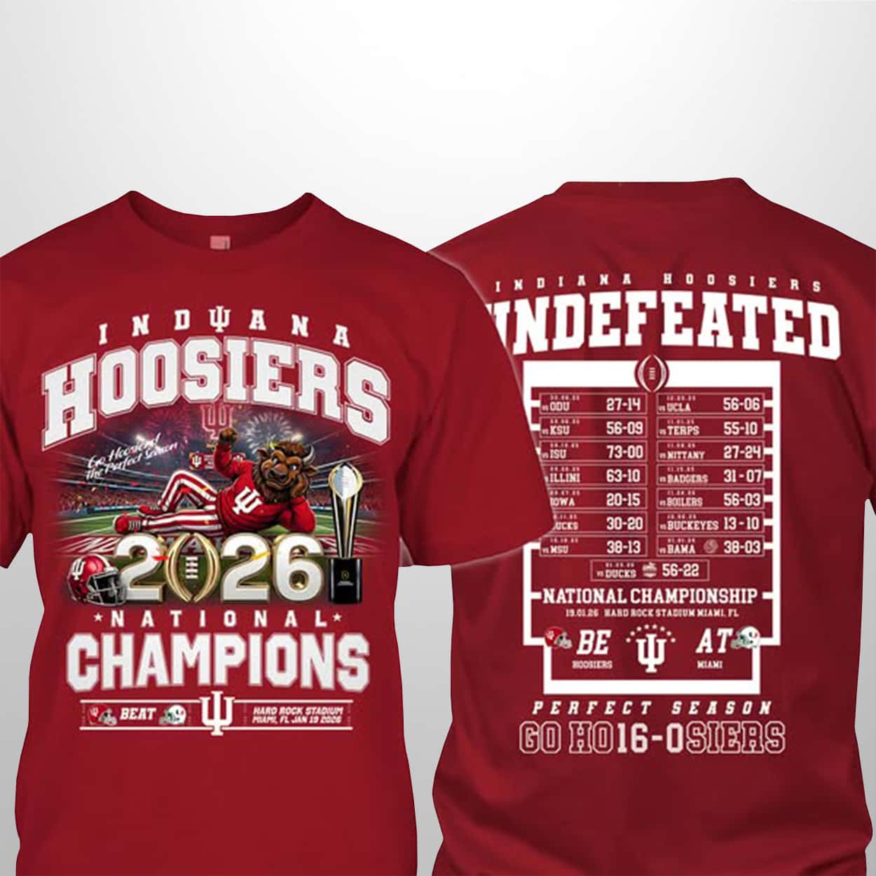 This isn’t just a shirt—it’s a scoreboard of domination. The front bursts with energy, featuring a dynamic football player mid-action, the iconic Indiana Hoosiers logo, and the victorious proclamation: “2026 NATIONAL CHAMPIONS.” Flip it over and you’ll find the full undefeated schedule, each game a blowout, each score a mic drop. At the bottom, a cheeky twist on the team name—“GO HO16-0SIERS”—cements the legacy.