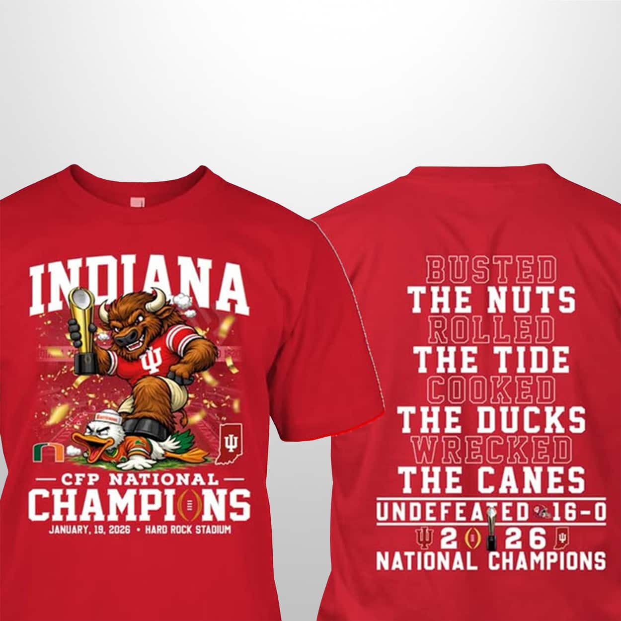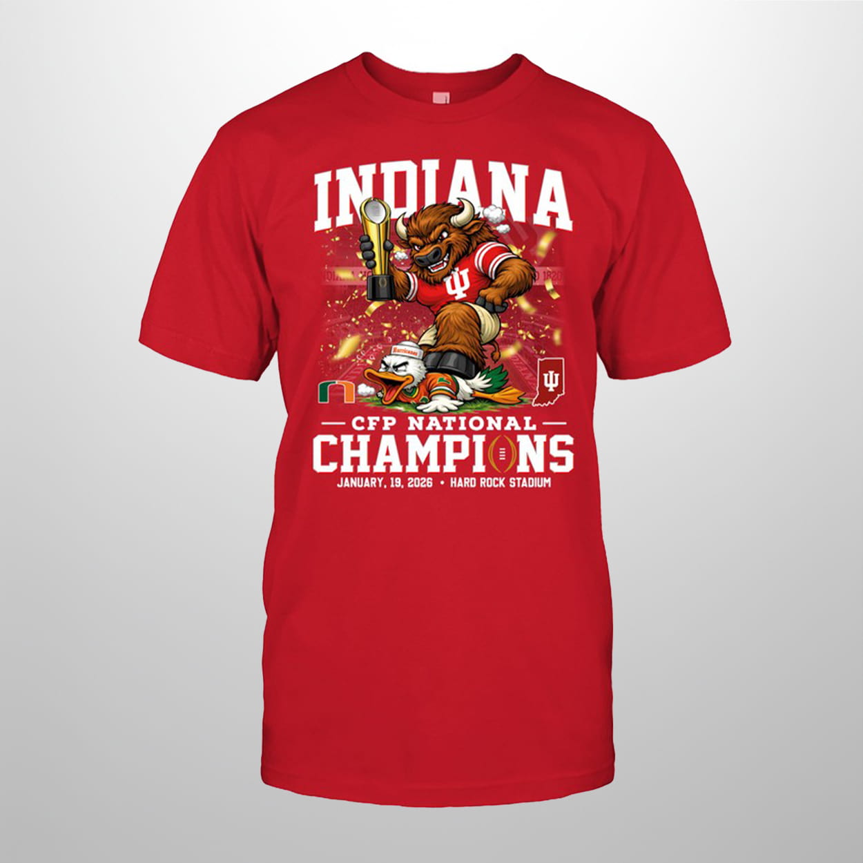 Commemorate the most legendary season in college football history with this shirt. This vibrant red tee celebrates the Hoosiers’ spectacular rise to the top, culminating in their historic victory at Hard Rock Stadium on January 19, 2026. The front prominently features the iconic IU bison mascot triumphantly hoisting the CFP trophy while standing over a defeated duck—a playful nod to the dominant playoff performance. With “INDIANA” and “NATIONAL CHAMPIONS” printed in bold, crisp lettering, it is a timeless piece for any fan who witnessed the “impossible” become reality.
