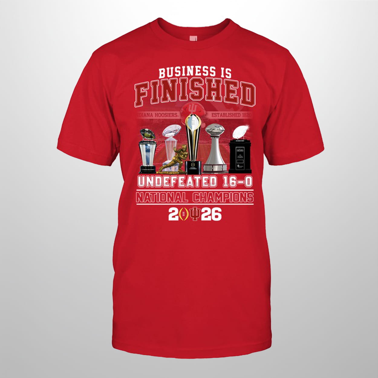 This vibrant red commemorative shirt is a must-have for any Indiana University fan who witnessed the impossible. The front of the design loudly declares “BUSINESS IS FINISHED” in bold, collegiate lettering, centered above a majestic display of championship trophies and the iconic IU logo. It proudly showcases the “16-0 Undefeated” status and the “National Champions” title that redefined Hoosier football in 2026.