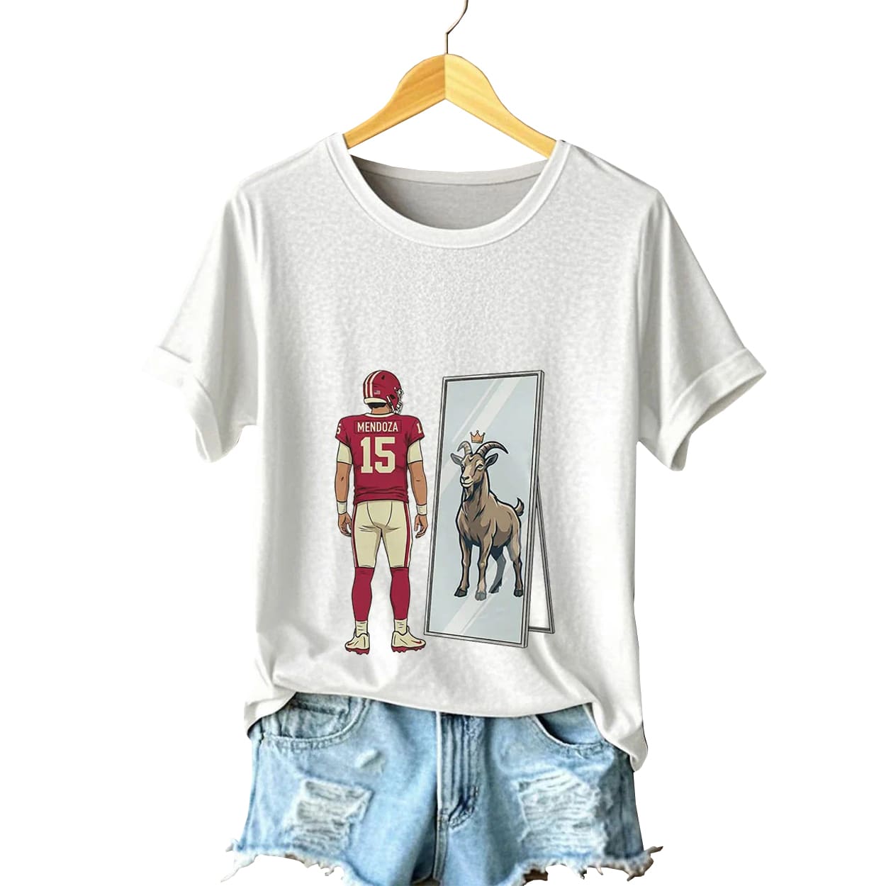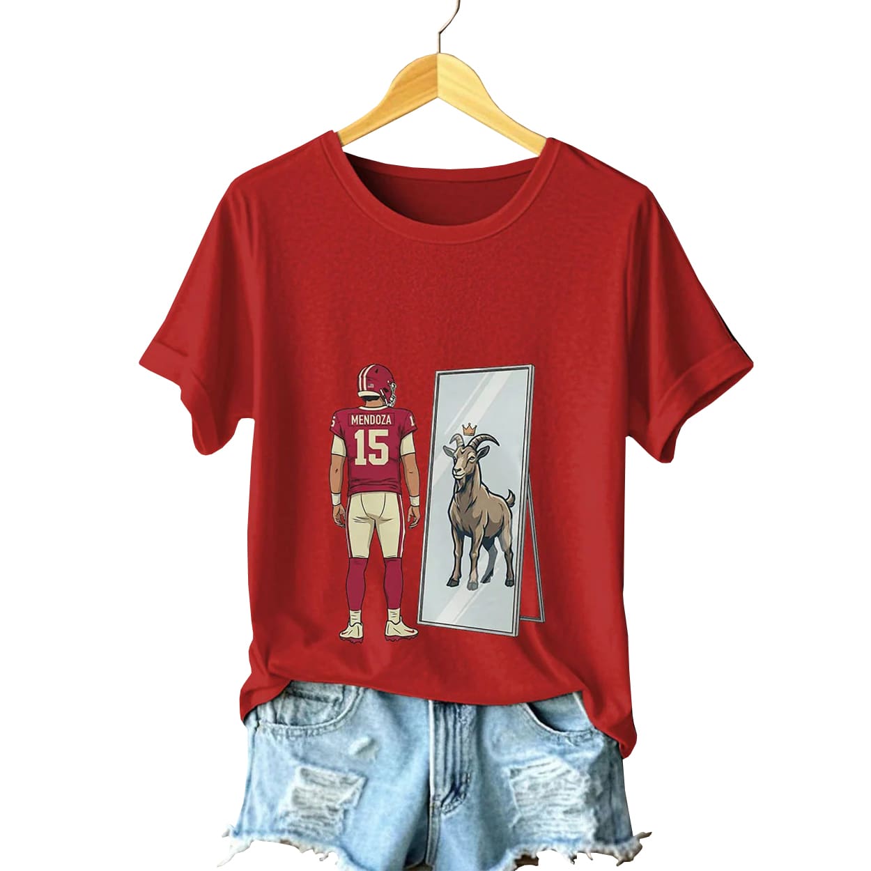 This striking red tee captures the spirit of the most legendary era in Indiana football history. The design features a stylized illustration of star quarterback Fernando Mendoza from behind, sporting his iconic crimson number 15 jersey. As he stands before a full-length mirror, the reflection reveals a regal, crowned goat—the ultimate symbol for the “Greatest of All Time.” It is a visually sharp and playful tribute to the poise and talent of the man who transformed the program and captured the heart of Bloomington.