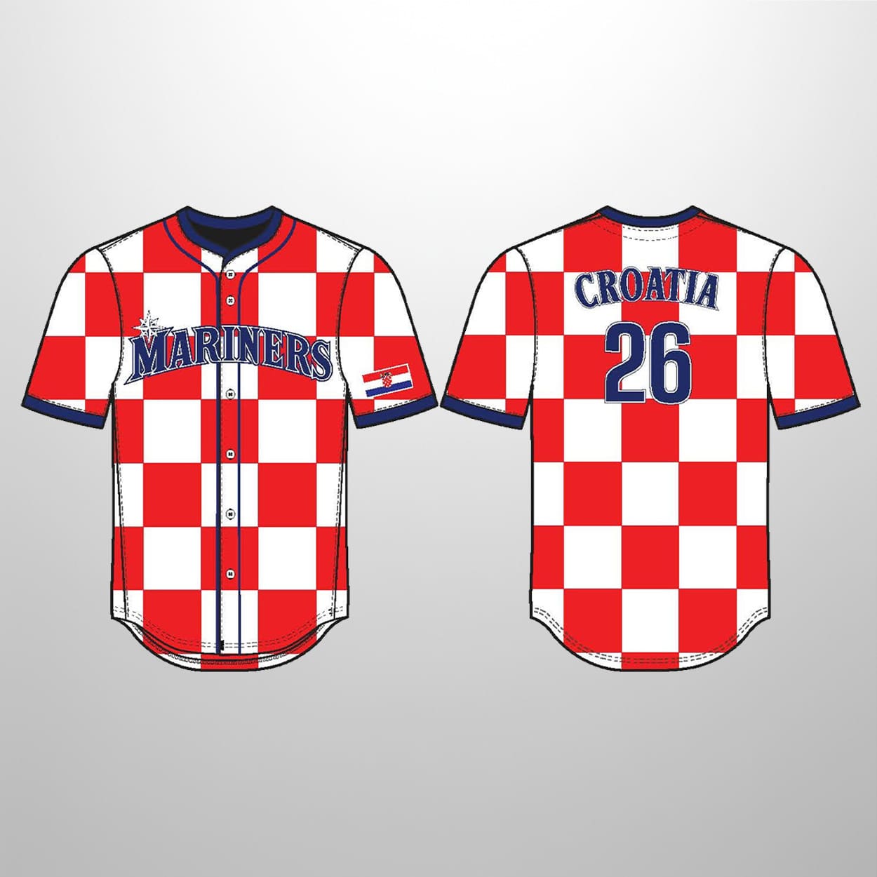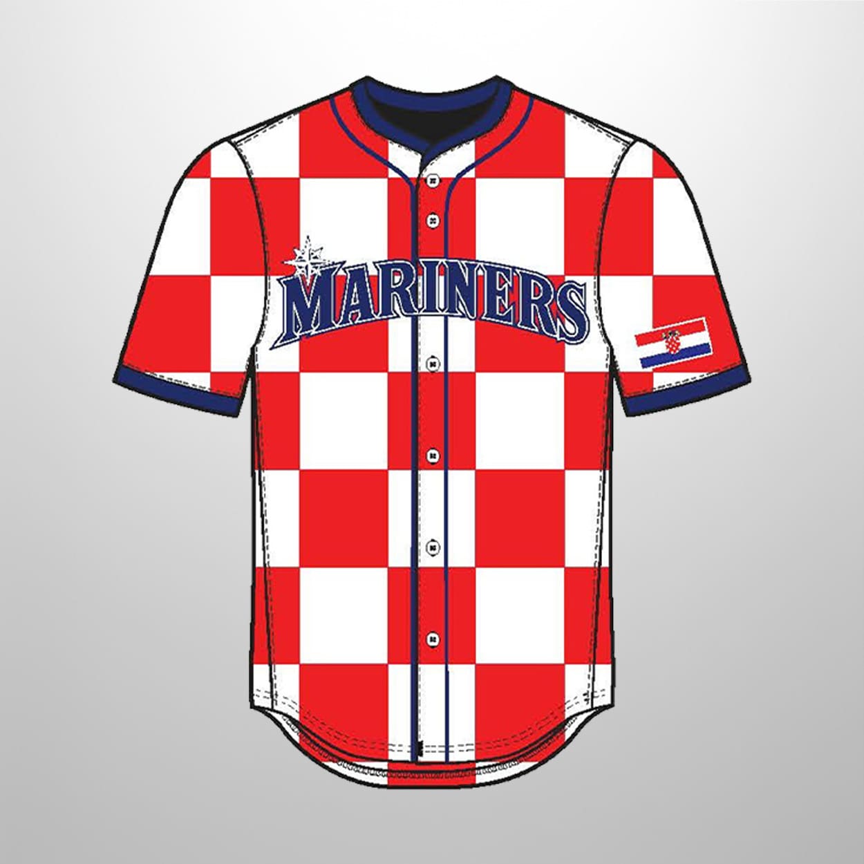 Get ready to stand out in the stands with this jersey, a vibrant celebration of culture and baseball. This eye-catching jersey features a red and white checkerboard pattern that echoes the iconic Croatian flag, contrasted by bold blue accents on the collar and sleeve cuffs. “MARINERS” stretches across the chest in deep blue, anchored by the team’s nautical star emblem. The left sleeve proudly displays the Croatian flag, while the back showcases “CROATIA” in crisp blue lettering above the number “26”—a nod to the year of this jersey.