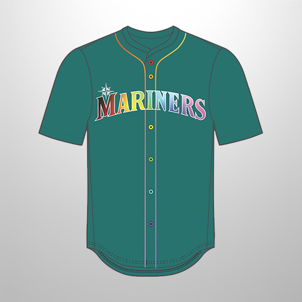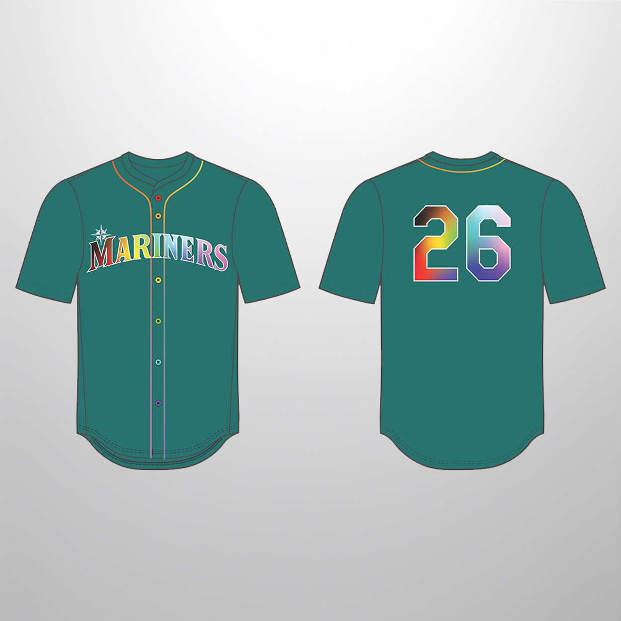This jersey is a dazzling tribute to both the team and the community. The front proudly displays “MARINERS” across the chest, each letter filled with a radiant rainbow gradient that bursts with color. A small compass rose sits above the “M,” anchoring the design with the team’s iconic symbol. Yellow piping along the button line and collar adds a playful pop of contrast. On the back, the number “26” shines in the same rainbow gradient, tying the look together in a way that’s both stylish and symbolic.