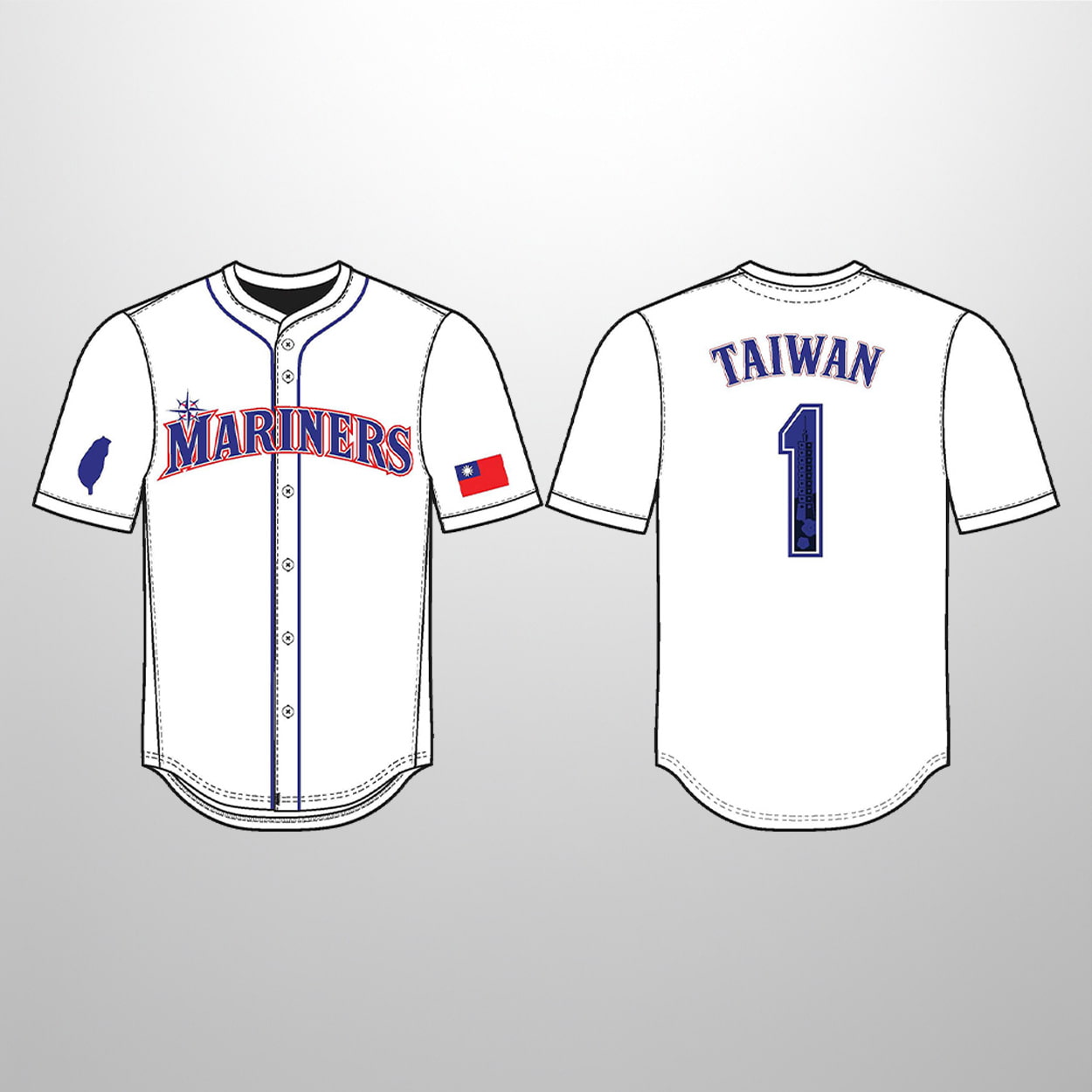 This jersey is a true standout for fans who love both baseball and cultural celebration. The front proudly displays “MARINERS” in bold, stylized lettering, with the team’s signature compass rose cleverly integrated into the “M.” Blue piping runs along the button line and collar, adding a crisp finish. On the left sleeve, a silhouette of Taiwan shines in blue, while the right sleeve features the vibrant national flag of Taiwan. Flip to the back, and you’ll find “TAIWAN” printed across the shoulders, with a bold number “1” beneath it—both in a sleek blue design that ties the look together.