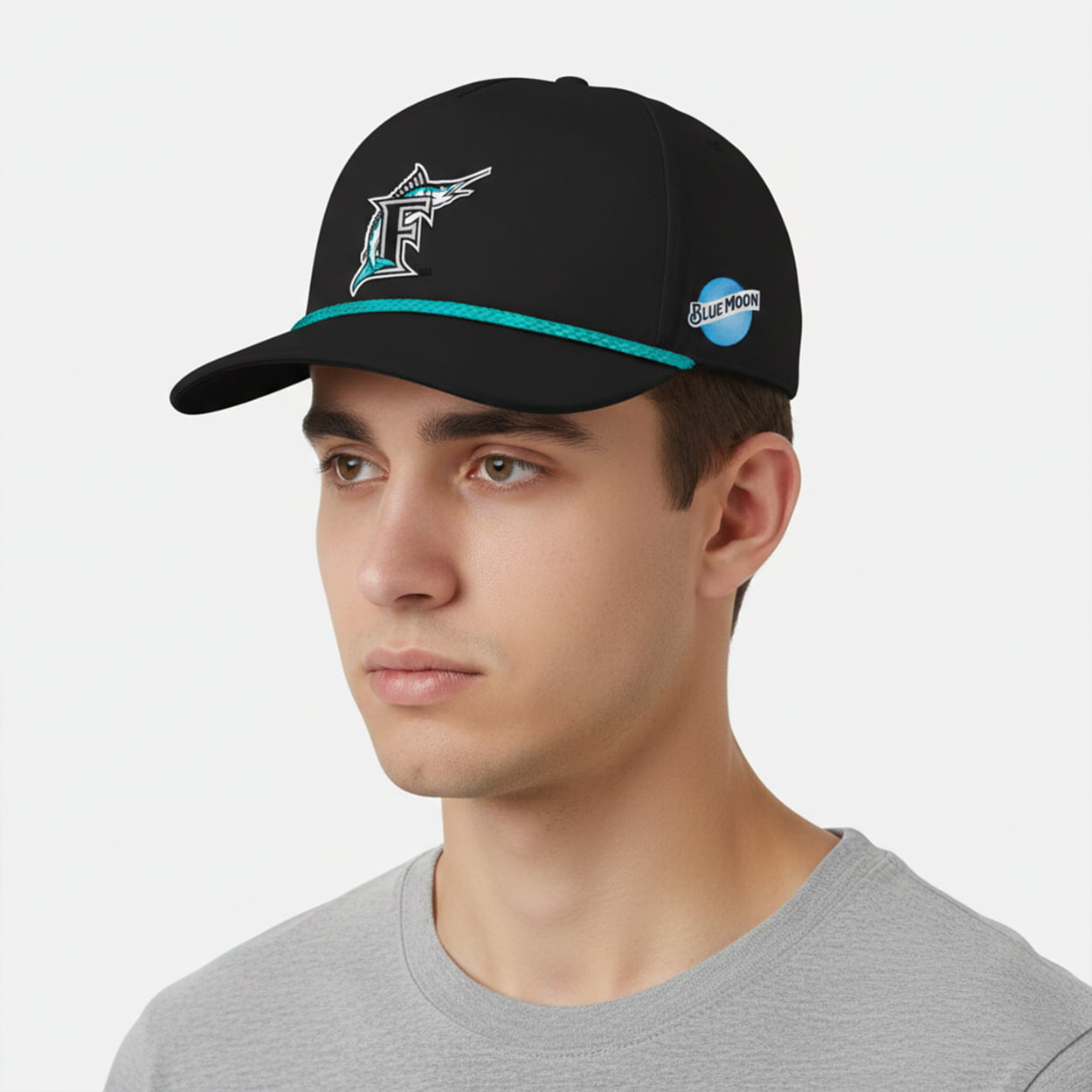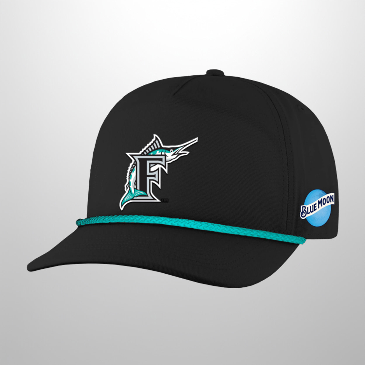 This hat is a head-turner from the moment you put it on. With its sharp black crown and curved brim, this cap sets the stage for the team’s iconic logo: a stylized marlin leaping through the letter “F,” embroidered in teal, white, and black. A teal rope detail runs across the front panel, adding a playful pop of color that ties the whole look together. On the side, a bold circular patch featuring “BLUE MOON” in crisp white letters against a deep blue background adds a unique twist, making this cap more than just team gear—it’s a collector’s piece.