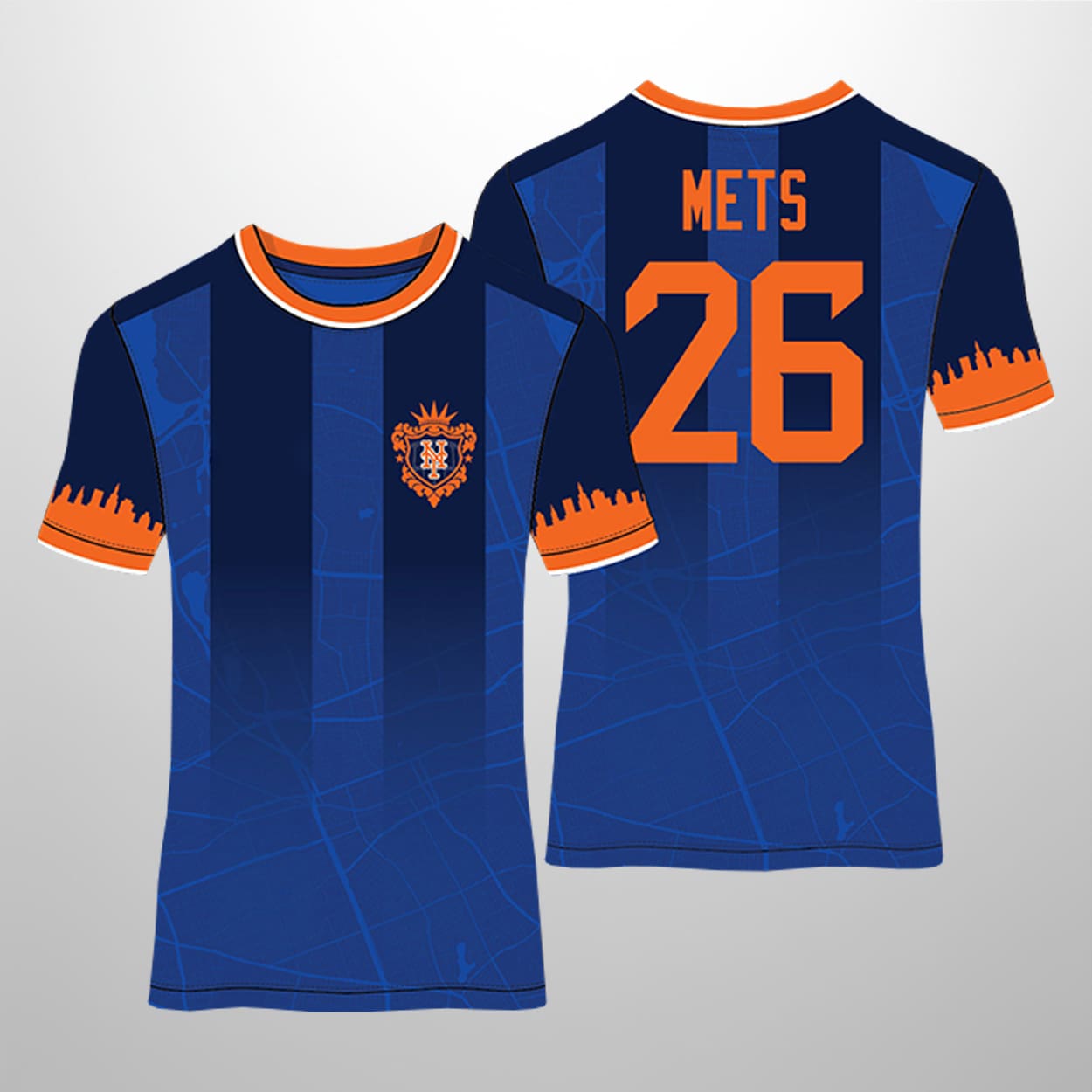 - Orange accents on collar and cuffs: A burst of energy, representing the fiery spirit of the Mets community.